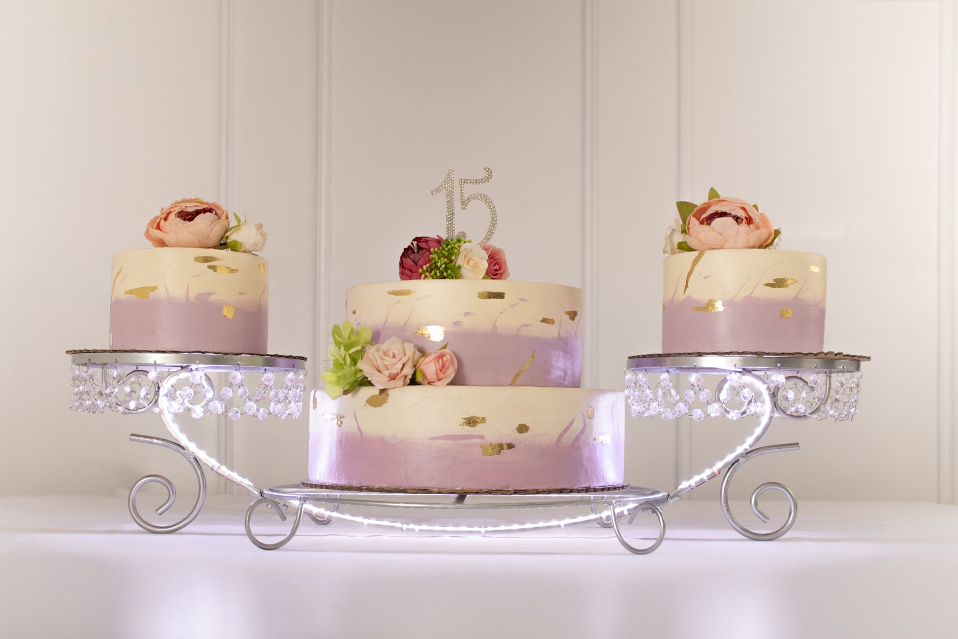 Nuestra clásica y muy popular Arcadia, ahora con luz led y pedrería de acrílico tipo cristal en los aros laterales. Incluimos un eliminador para simplemente conectar a la corriente y hacerla brillar.  Está base es la combinación entre funcionalidad, diseño y elegancia. Resaltará cualquier pastel o postre que coloques en el y es muy ligera. ¡Perfecta para cualquier evento!