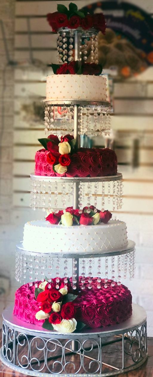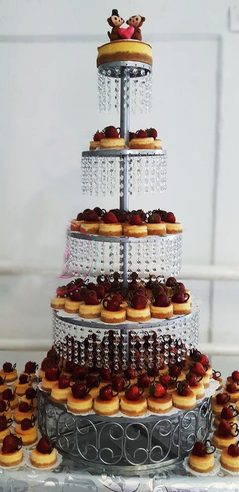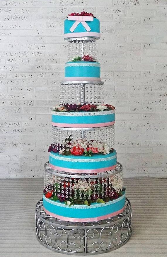 Base de acero macizo con recubrimiento de pintura electroestática color cromo de gran duración. Perfecta para todo tipo de eventos, desde infantil, hasta bodas o quince años, cada piso lleva decoraciones interiores de tal forma que puede utilizarse para pastel, cupcakes u otros bocadillos.