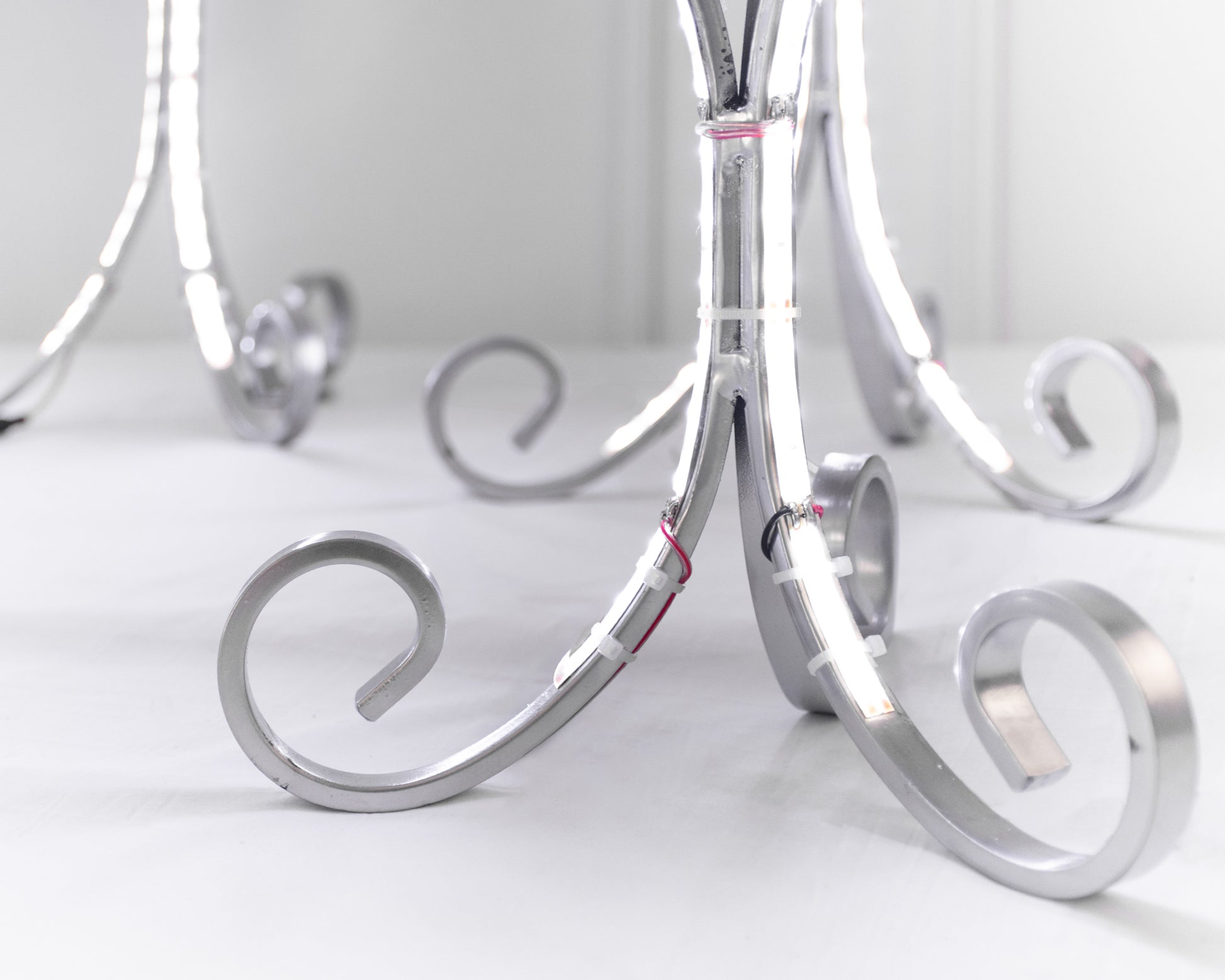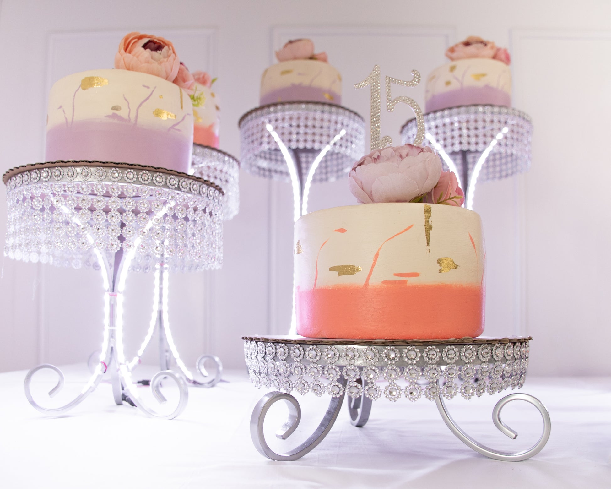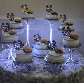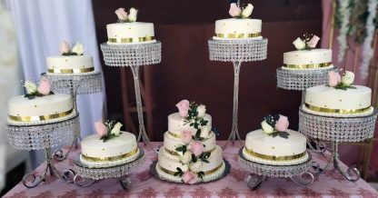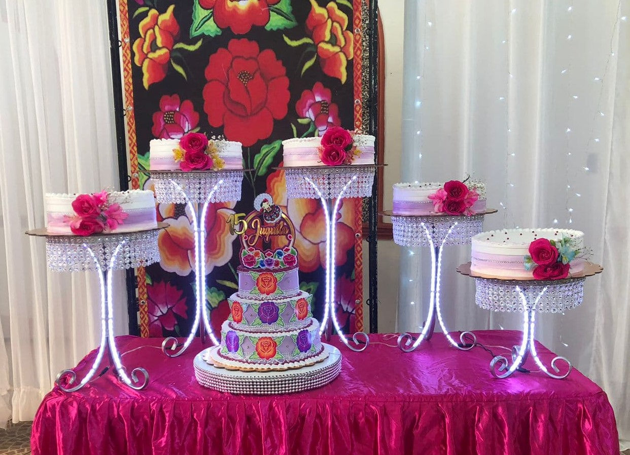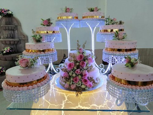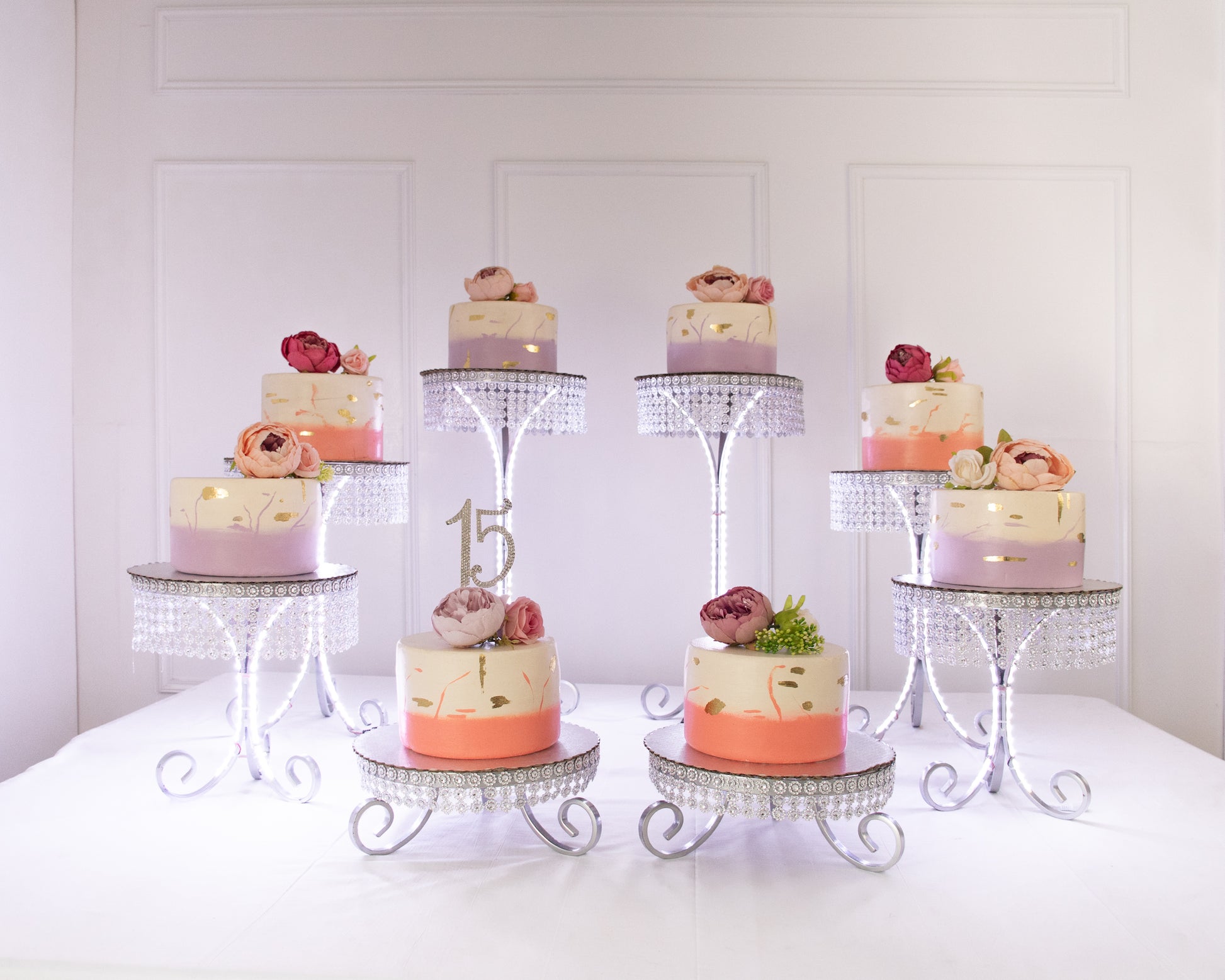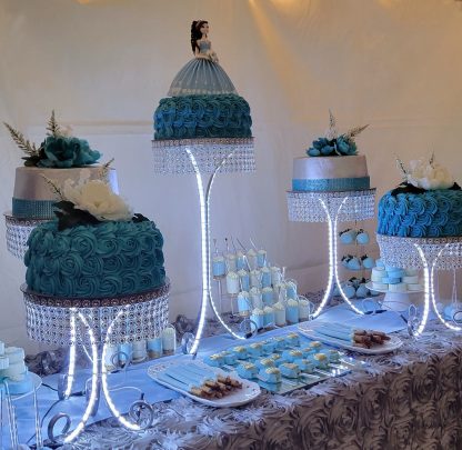 Hermoso Juego de 8 soportes de acero macizo color cromo con recubrimiento de pintura horneada de gran duración y resistencia a la oxidación.  Este es nuestro juego de bases más vendido, y no es para menos. Por ese precio te llevas ¡8 soportes! estarás listo para montar varios pasteles para un gran evento. Utilízalos para pasteles o postres sus diferentes alturas le darán volumen a tu presentación sin esfuerzo. Son elegantes y funcionales, son delgados y finos así que caben en casi cualquier mesa, El listón que agregamos les da un toque magnífico y es fácil de limpiar. 6 de esos 8 soportes llevan luz y están listos para conectarse a la luz y hacer brillar tus pasteles. Puedes usar, 1, 4, 6 o los 8 soportes de acuerdo a la cantidad de pastel requerido. Lleva tus pasteles al nivel más profesional con una gran presentación, estas bases serán tu mejor aliado.