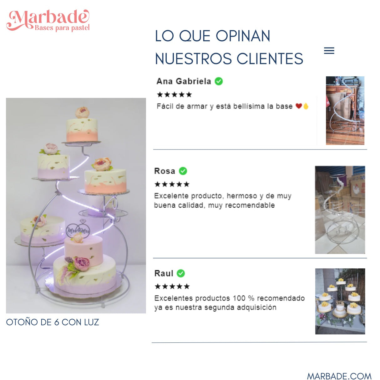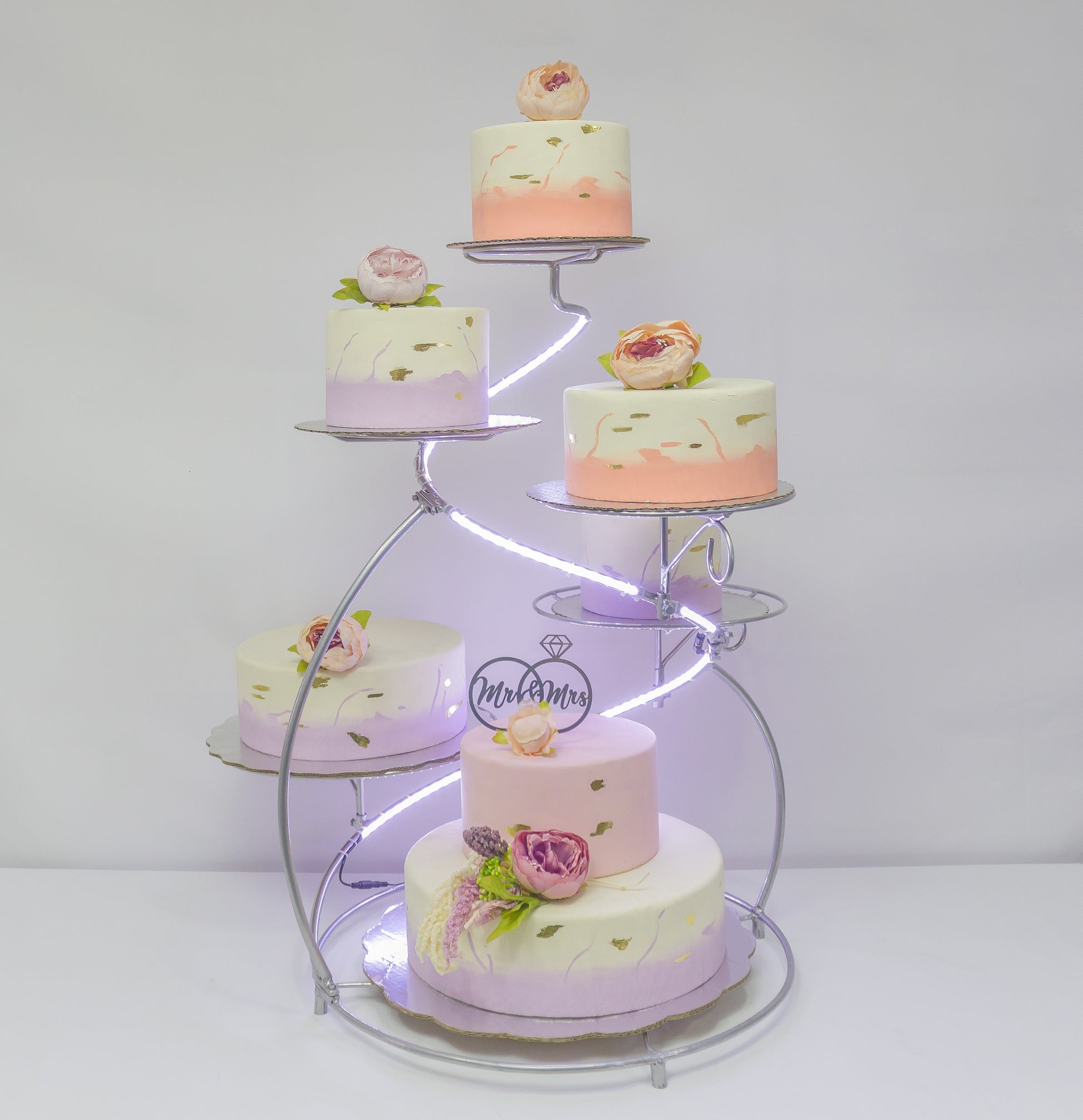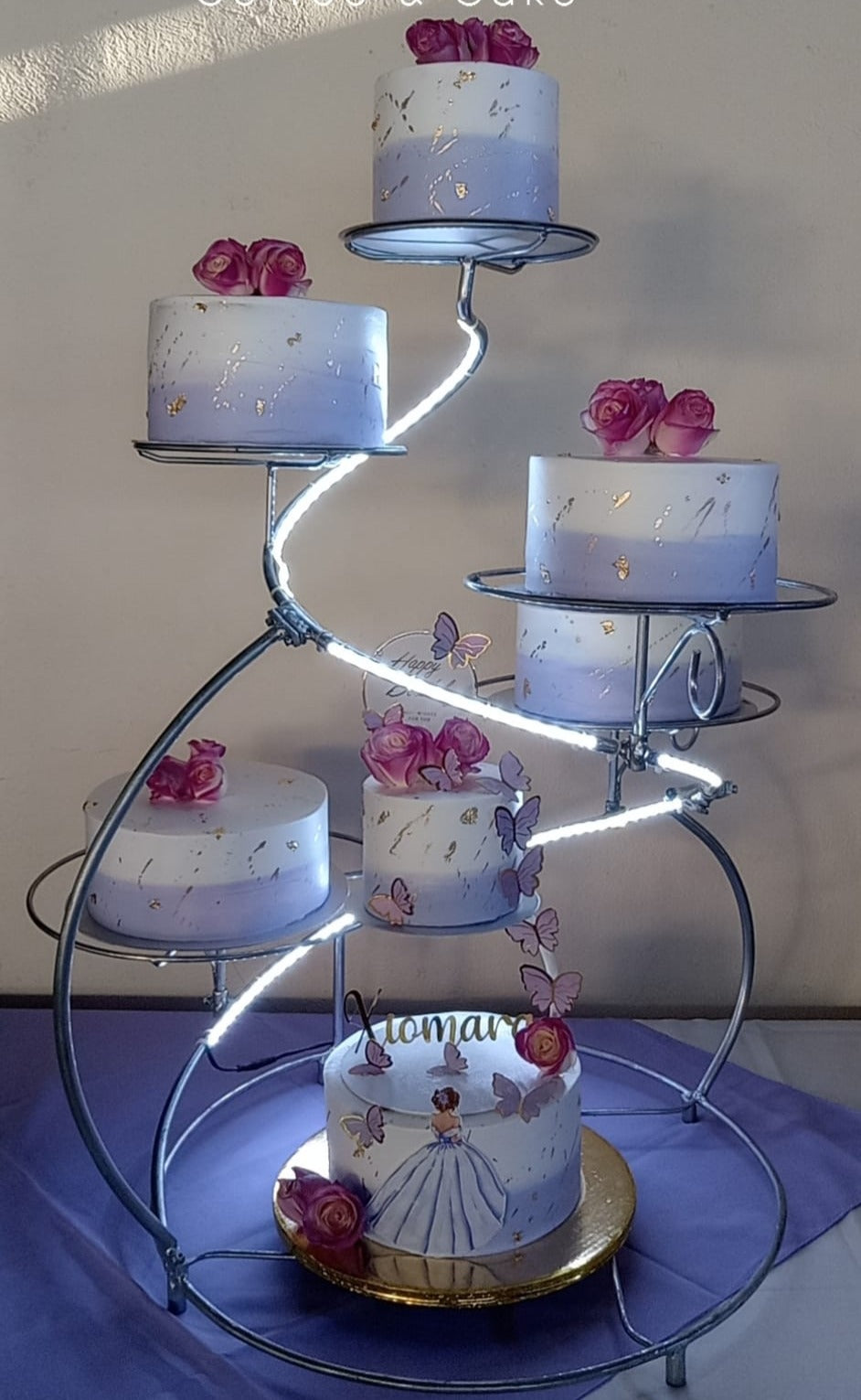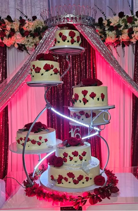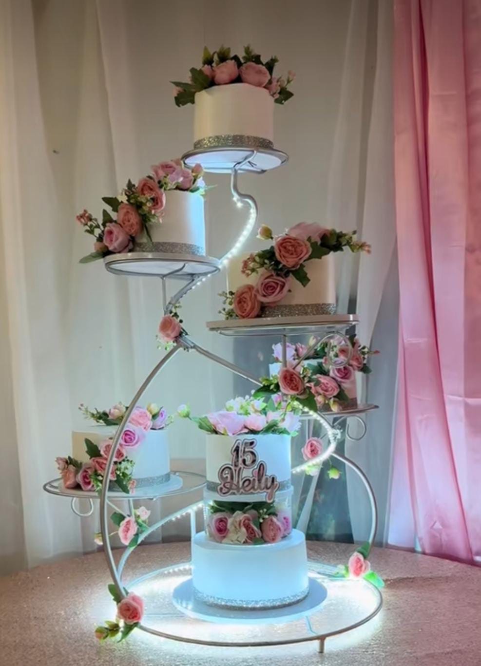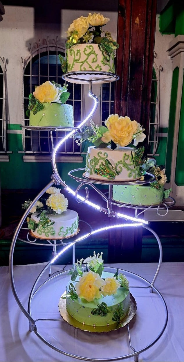 Base de acero macizo con recubrimiento de pintura electroestática color cromo de gran duración. Esta hermosa base con forma de espiral es realmente bella y práctica. Los pasteles se despliegan hacia arriba así que puedes colocar varios pasteles en poco espacio y hacerlos lucir de ensueño, aunque no seas un profesional. Ideal para cualquier tipo de evento, el aro de abajo de 24 pulgadas de diámetro puede utilizarse para un gran pastel de pisos o bien para colocar un arreglo. La luz led le dará un toque único que hará brillar tus pasteles, puedes conectarla o no de acuerdo al evento o a la hora del día, dejarla sin luz en el día y encenderla en la noche. Tus clientes la amarán.