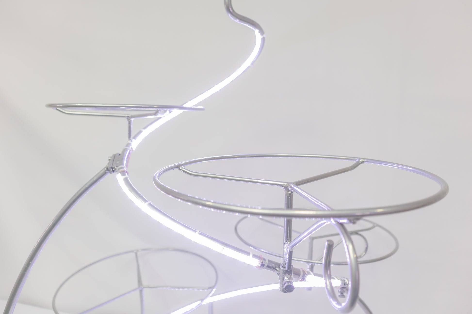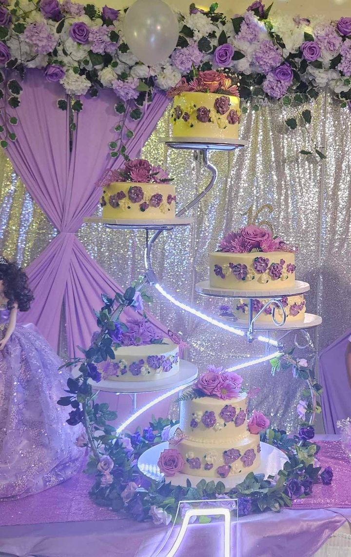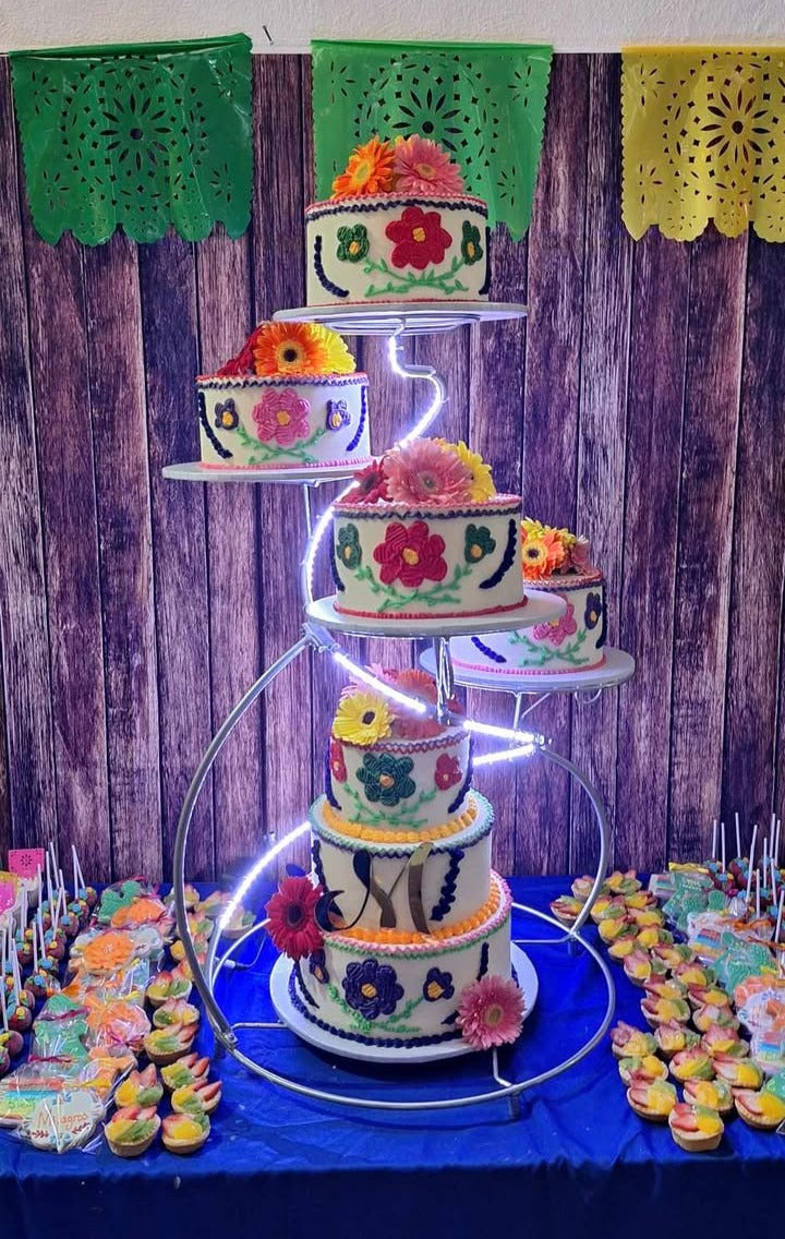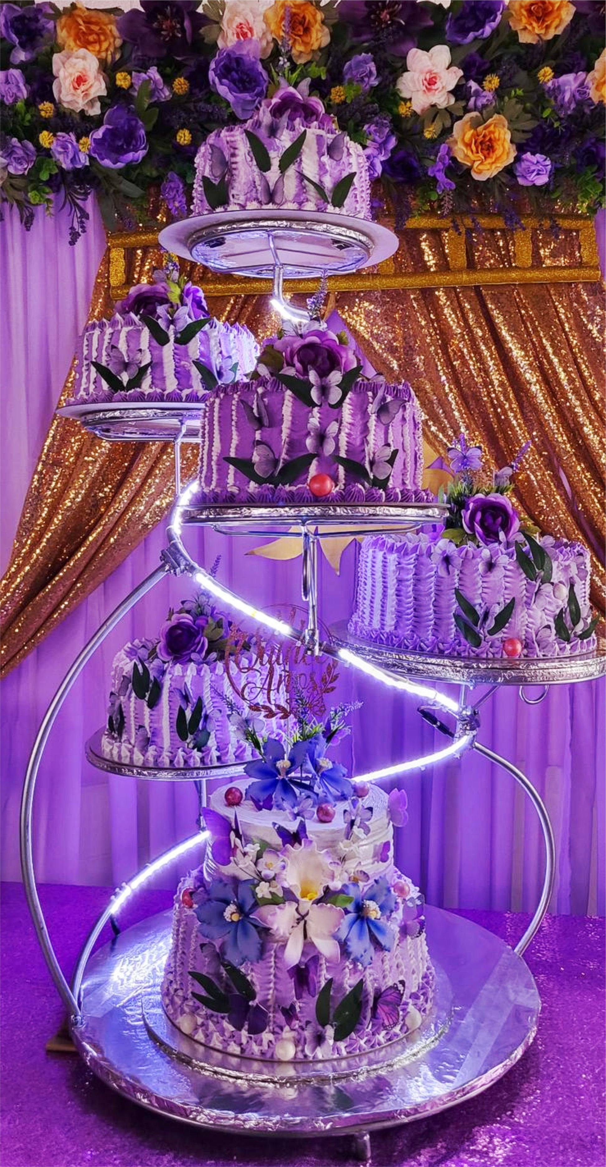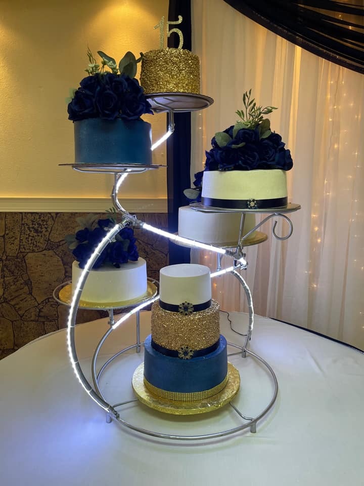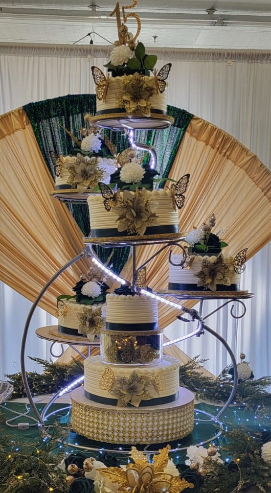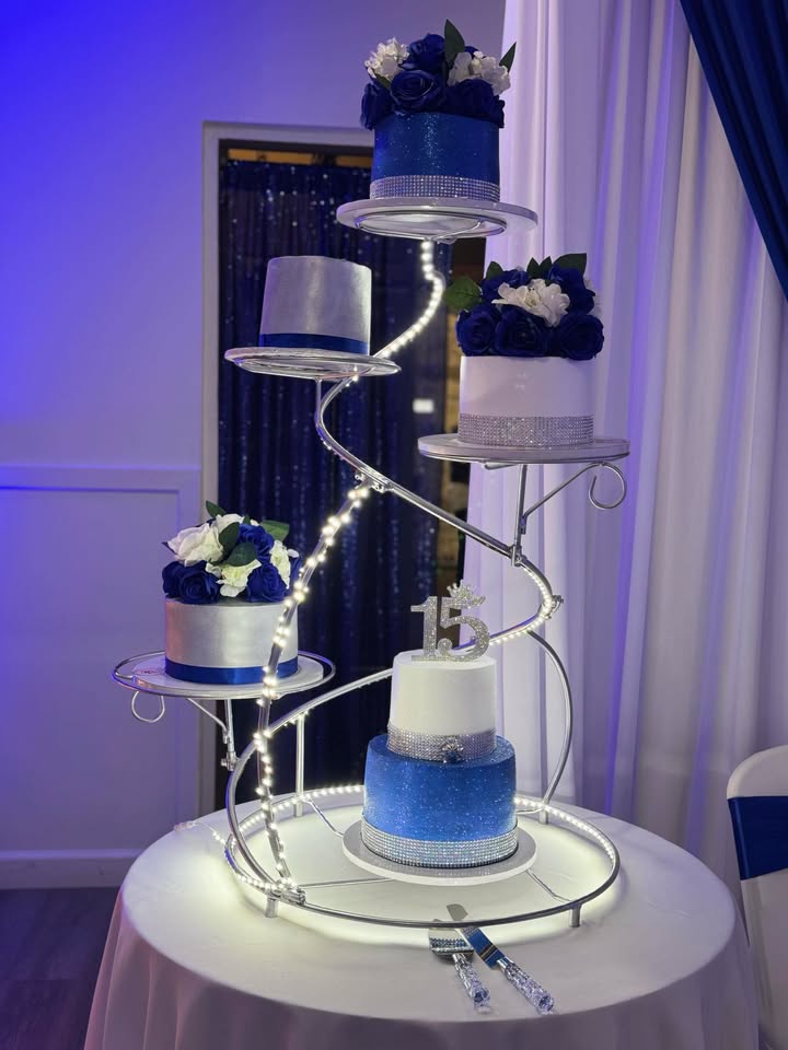 Base de acero macizo con recubrimiento de pintura electroestática color cromo de gran duración. Esta hermosa base con forma de espiral es realmente bella y práctica. Los pasteles se despliegan hacia arriba así que puedes colocar varios pasteles en poco espacio y hacerlos lucir de ensueño, aunque no seas un profesional. Ideal para cualquier tipo de evento, el aro de abajo de 24 pulgadas de diámetro puede utilizarse para un gran pastel de pisos o bien para colocar un arreglo. La luz led le dará un toque único que hará brillar tus pasteles, puedes conectarla o no de acuerdo al evento o a la hora del día, dejarla sin luz en el día y encenderla en la noche. Tus clientes la amarán.