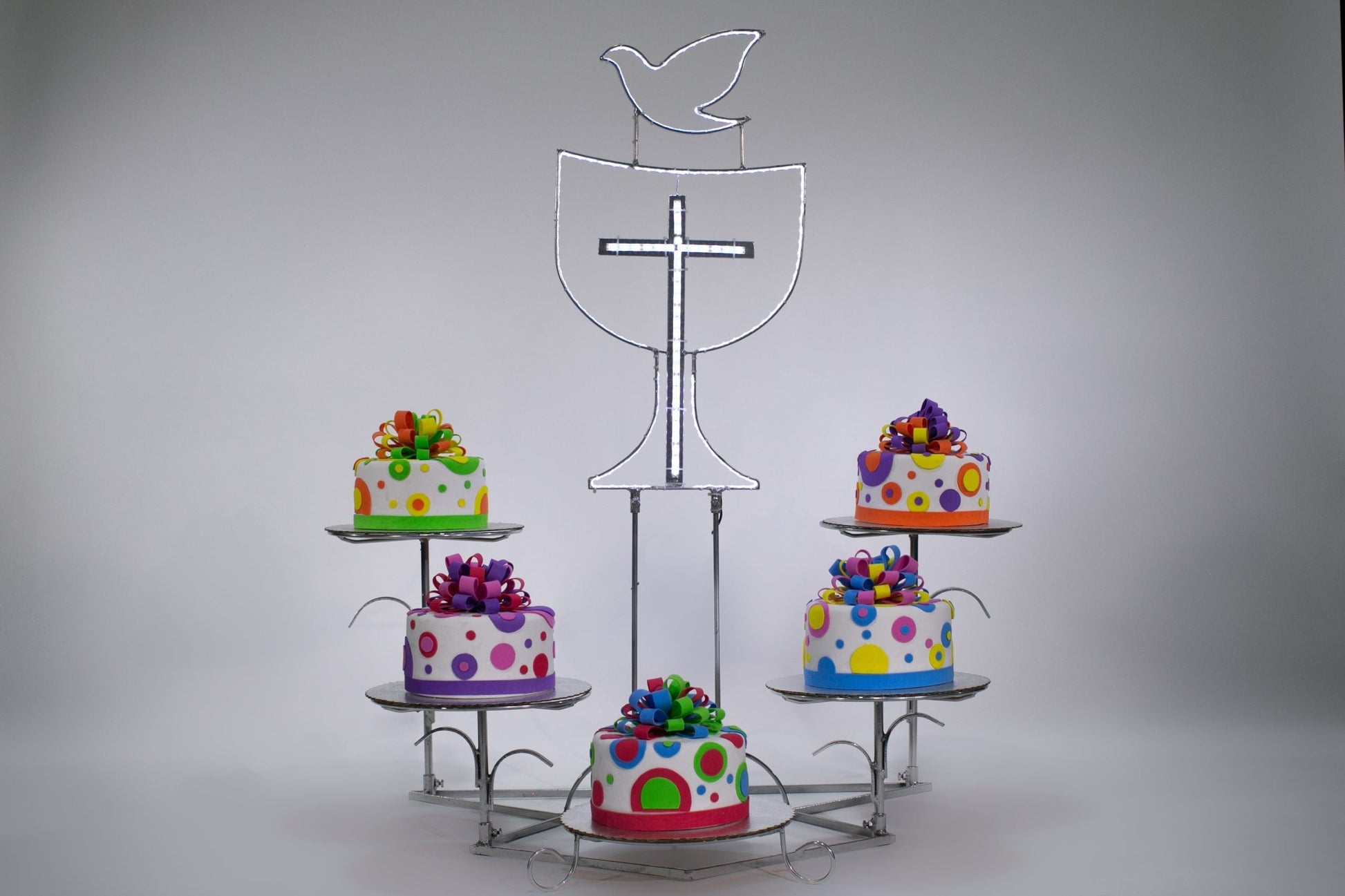 Ideal para eventos religiosos: bautizos, primera comunión, confirmación, la base incluye el cáliz con luz, el cáliz es intercambiable, se venden por separado otros personajes: Rayo Mcqueen, Mickey, Unicornio, Buzz Ligthyear  que se adaptan a la misma base.  Incluye tira de luz led colocada en la base y eliminador, está listo para conectar a la corriente y hacer brillar tus pasteles.