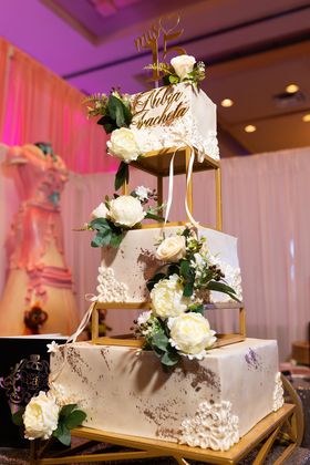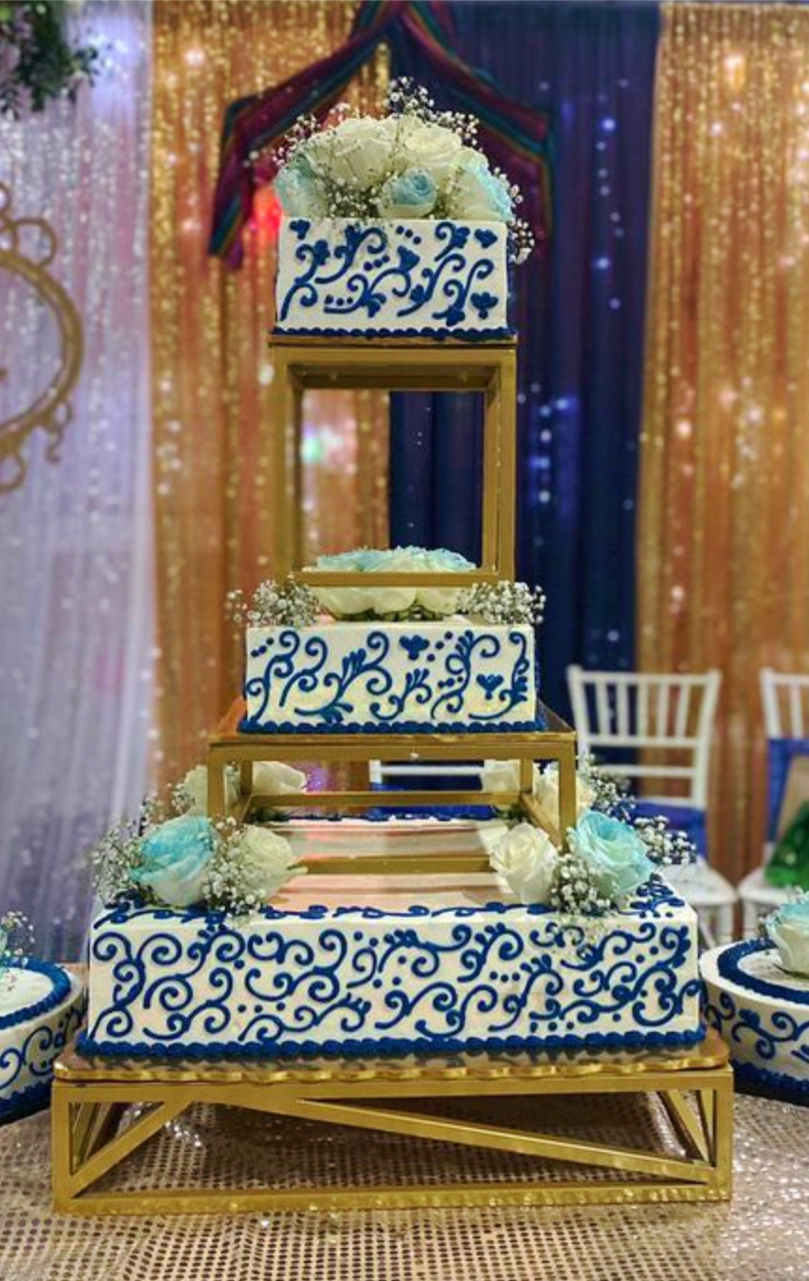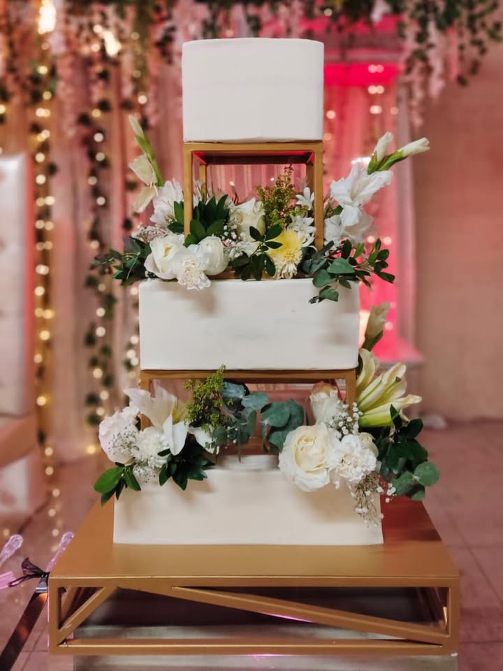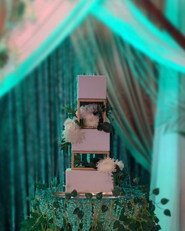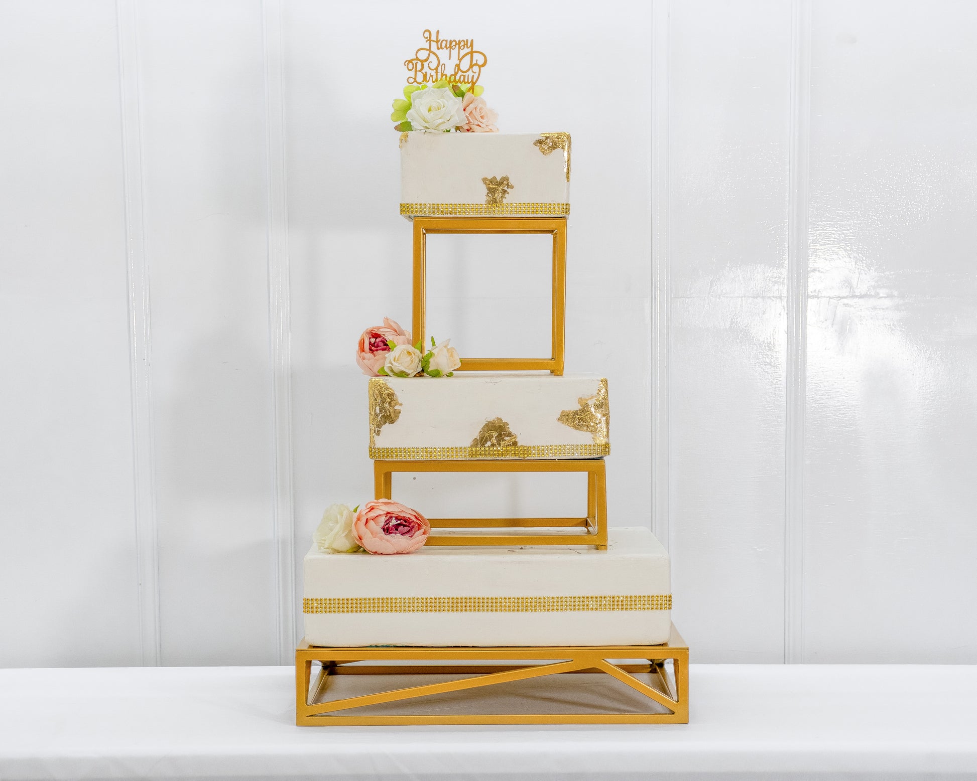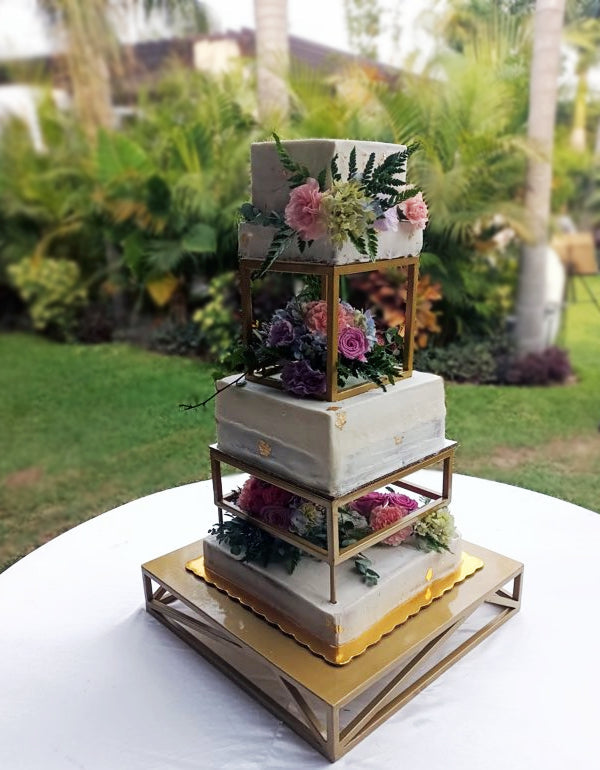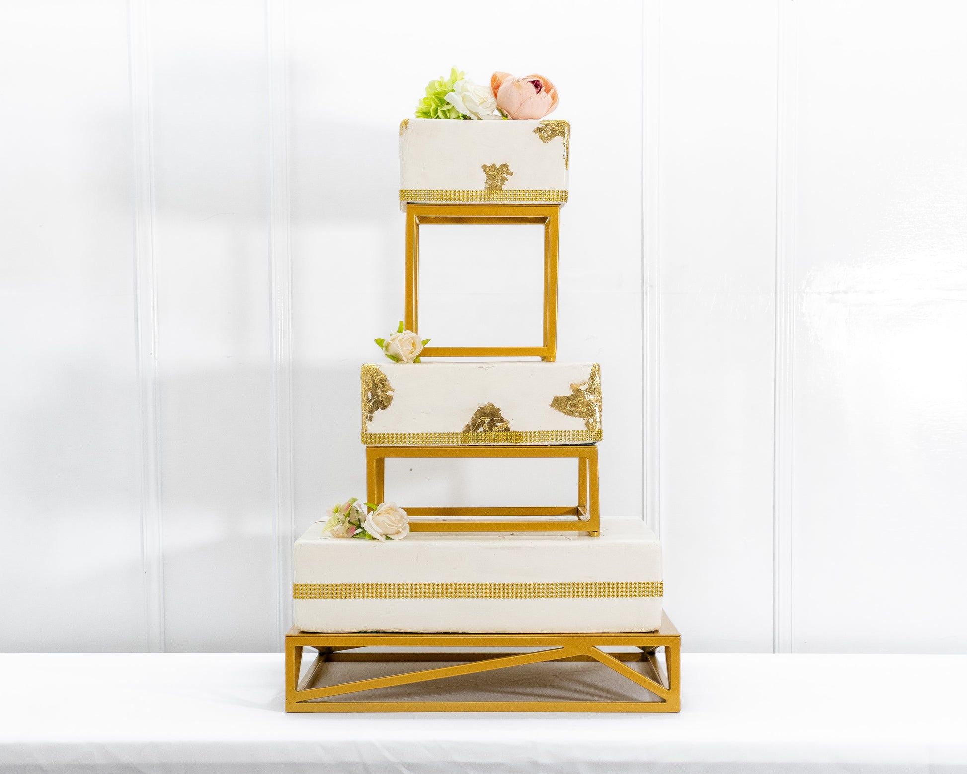 Este hermoso juego de bases incluye una base cuadrada de 20x20 pulgadas, con lámina para colocar pasteles o postres, puede usarse por separado o como en la imagen como parte del set. Este moderno set puede utilizarse como en la imagen para enterrarse en el pastel y dar una apariencia ultra elegante o bien, se puede utilizar por separado como ¨mesitas¨ individuales para colocar postres o snacks. Por su estilo chic minimalista puede utilizarse en cualquier evento: bodas, cumpleaños, quince años, aniversarios, baby shower, bautizo o cualquier otro. Perfecto como display para cualquier alimento, arreglo florar o elemento decorativo.
