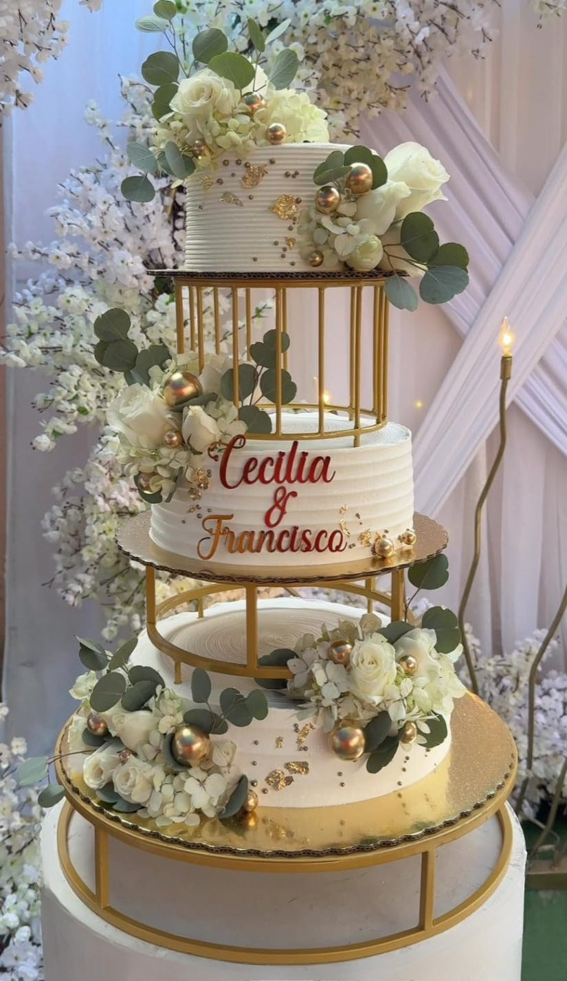 Este hermoso SET Jaula es lo último en tendencia para lograr un pastel de pisos con un toque moderno y sin complicaciones. Resalta cualquier pastel al añadir el espaciador pequeño en forma de jaula, coloca flores, naturaleza o la decoración de tu elección para dar un toque de sofisticación. La pieza mas grande, el soporte de 20" de diámetro, puedes utilizarla por separado para colocar pastel o postres individuales. Para lograr la forma de torre, coloca la pieza grande primero con el pastel mas grande, luego coloca el separador mediano enterrándolo en el pastel con su practicas “patas de 5”, coloca otro pastel y luego el separador en forma de jaula también enterrándolo, y por último un pastel pequeño. También puedes usar cada pieza por separado o colocar los pasteles en sus soportes de forma horizontal como se muestra en las fotos.