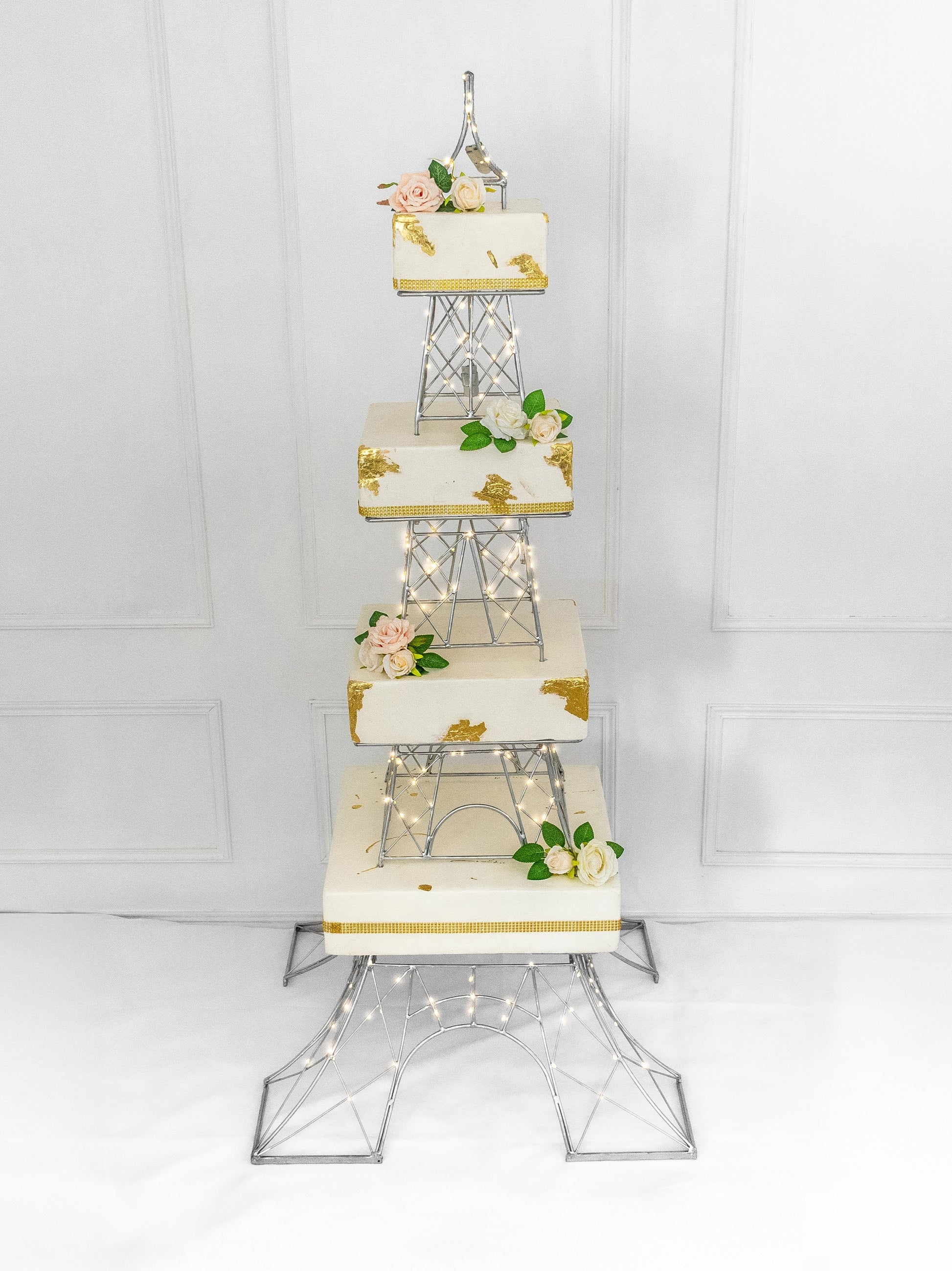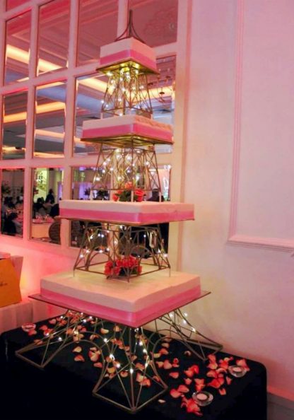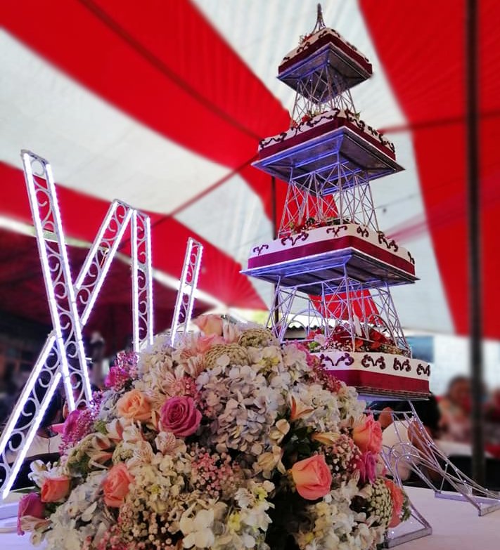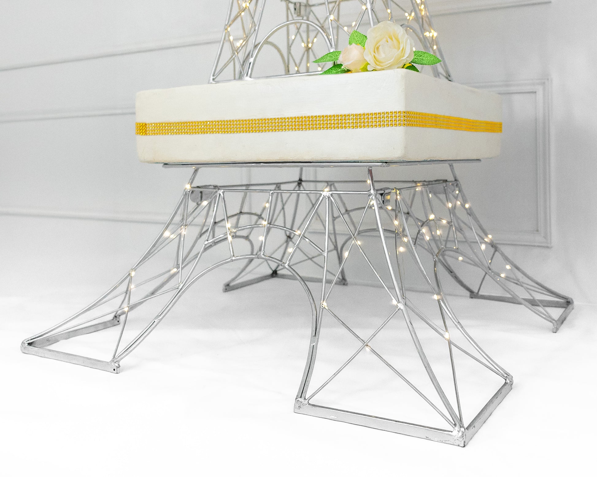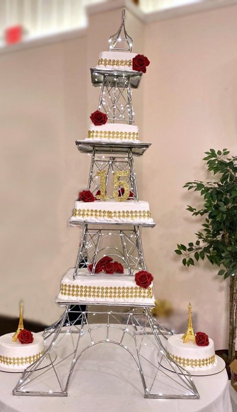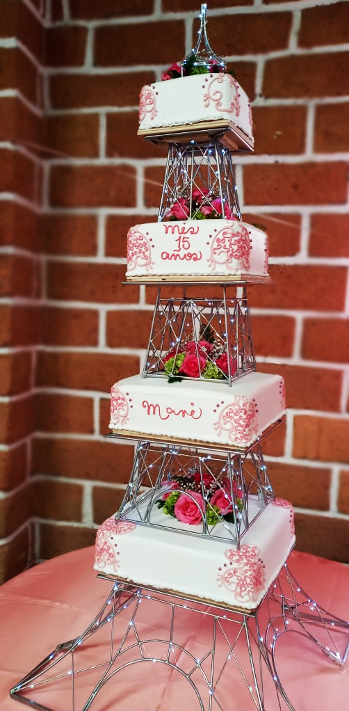 Ideal para cualquier evento, son 5 piezas individuales, primero se coloca la parte más ancha de la base, donde viene el arco, y luego se coloca el pastel, después se entierra la siguiente estructura, luego el pastel y así sucesivamente hasta formar la torre. Las luces vienen en cada pieza y se activan mediante pilas que vienen incluidas.