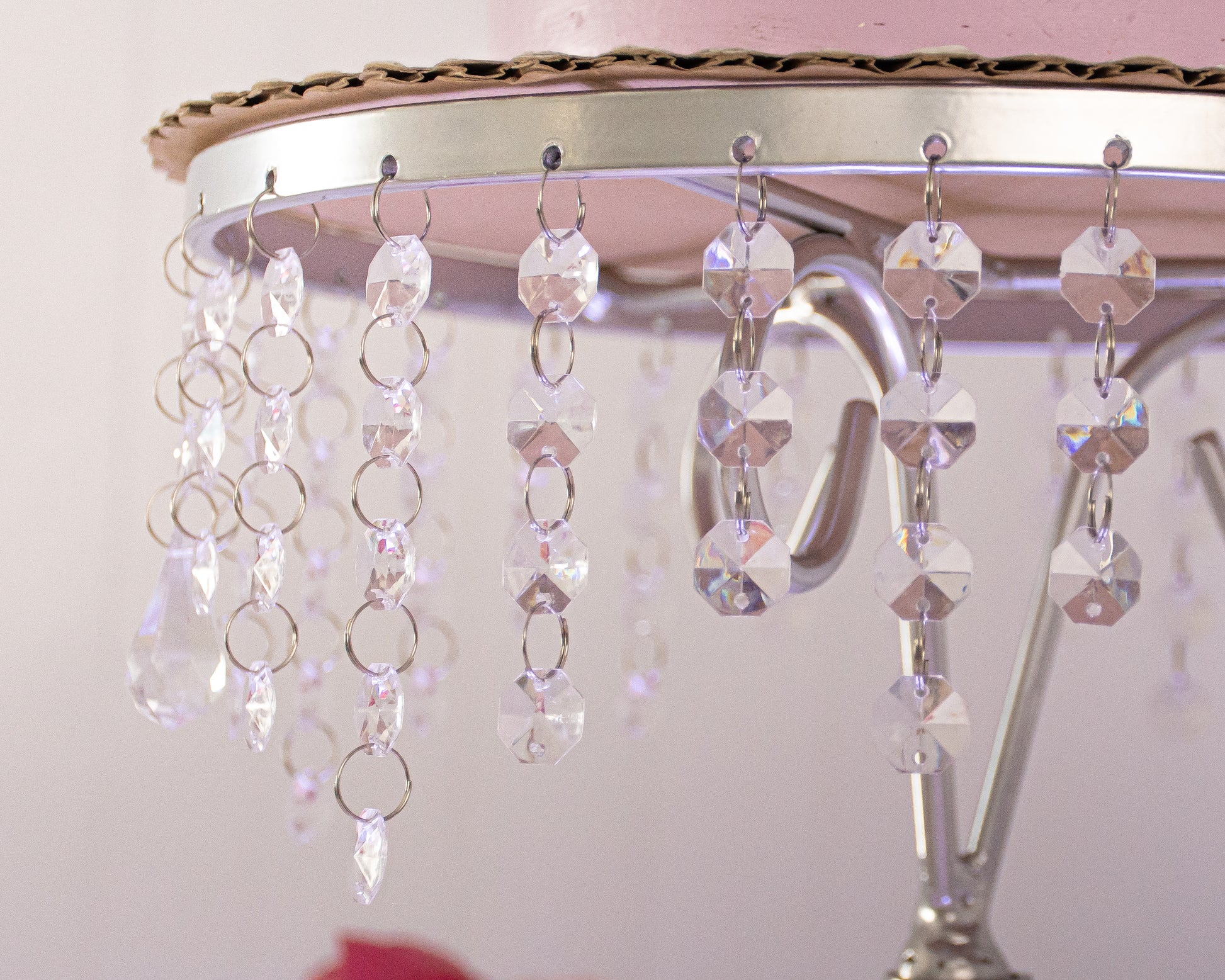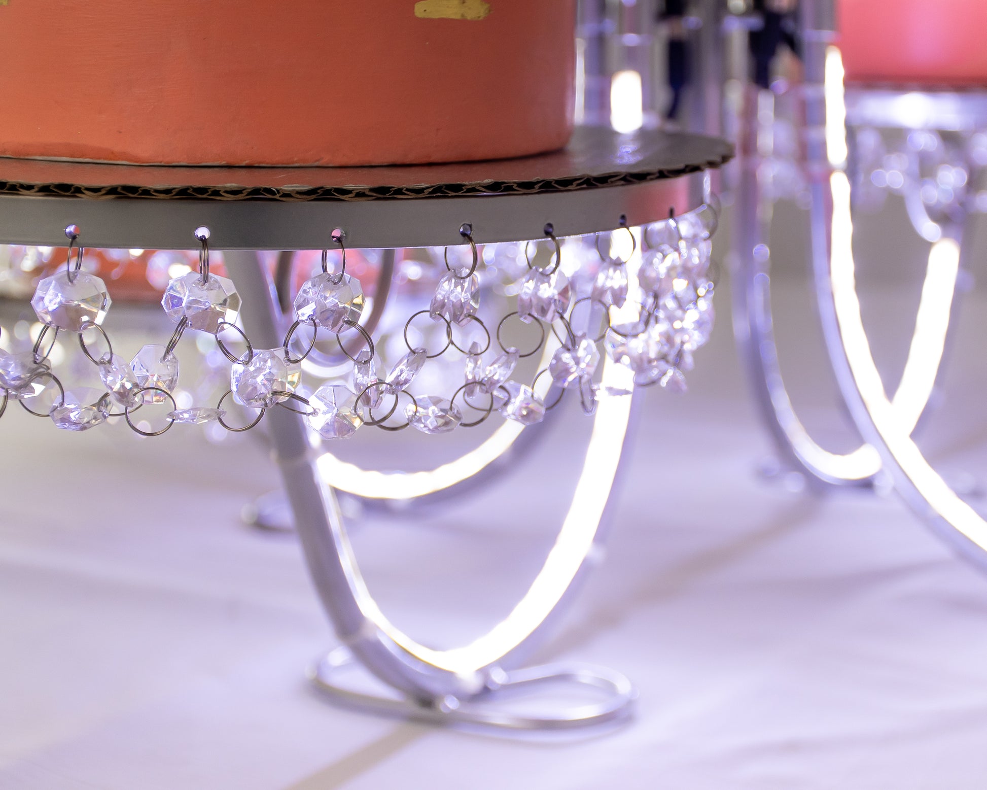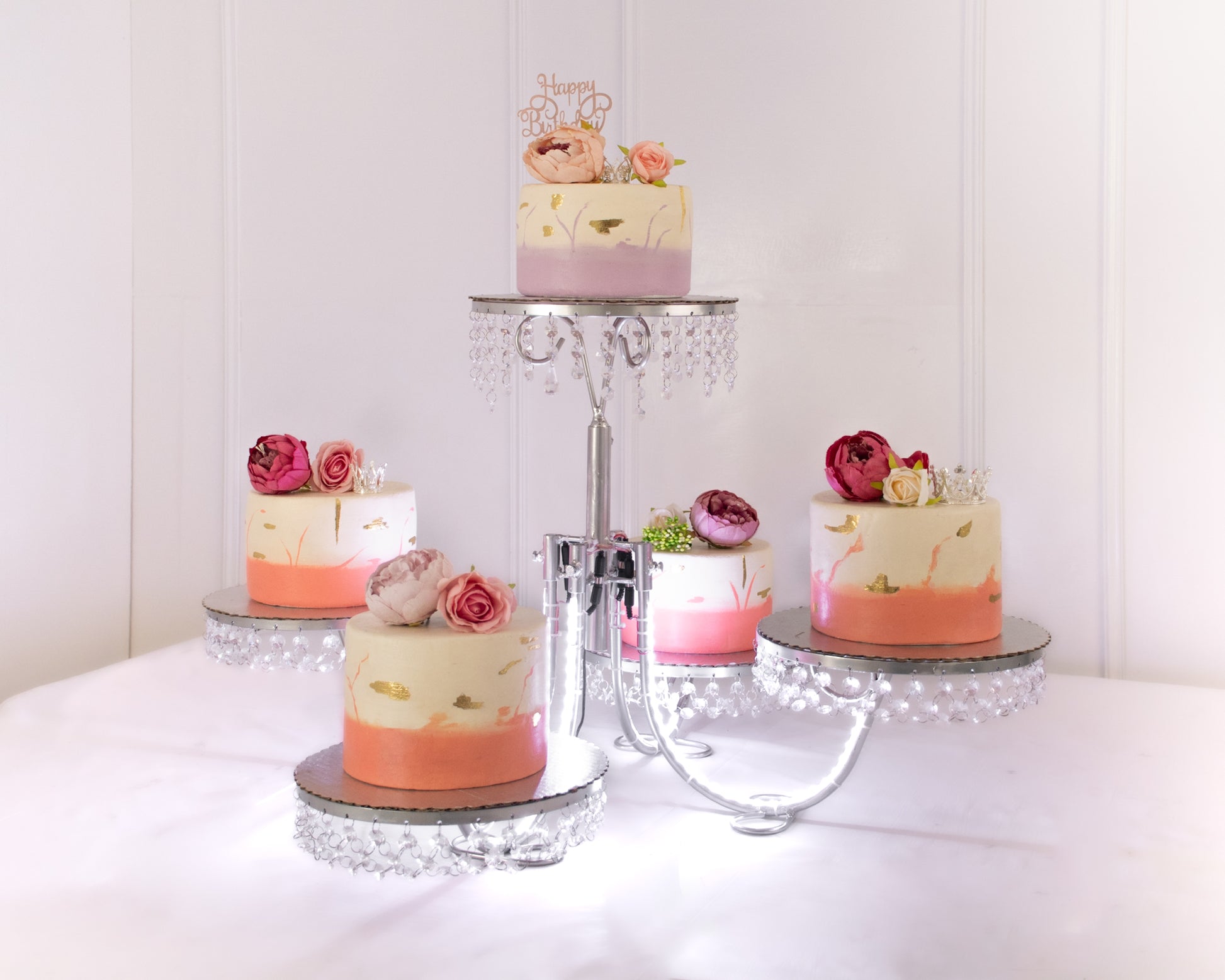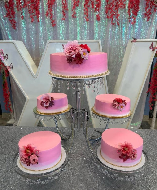 Hermosa base de acero macizo con recubrimiento de pintura color cromo horneada de gran duración. Esta base para pastel simula a una hermoso candelabro, incluye pedrería en cada uno de sus aros con luz de fondo que hará que brillen tus pasteles. Esta base es elegante y a la vez práctica, además cabrá en un espacio pequeño pero hará que tus pasteles sean el centro de atención creando volumen y presencia imponente,  Sus 5 aros de 12 pulgadas de diámetro pueden sostener pasteles de hasta 7 kilos por aro. Su elegante estilo puede adaptarse a cualquier diseño de pastel y cualquier evento como Bodas, Quinceaños y cumpleaños.