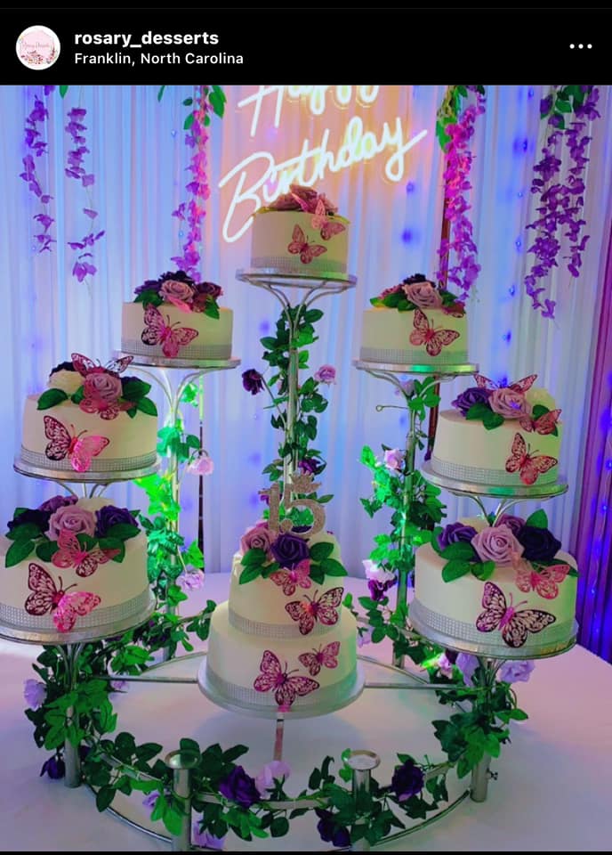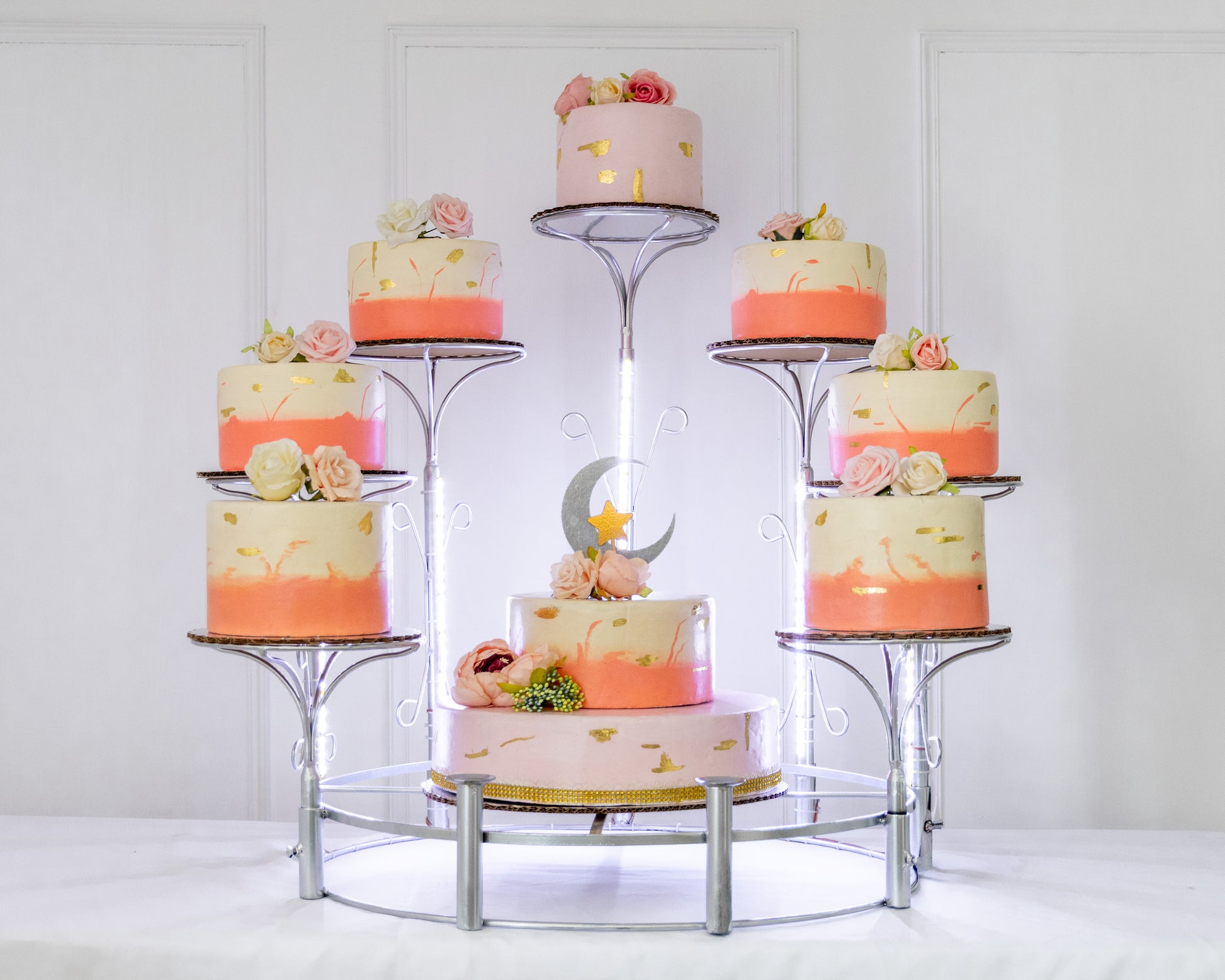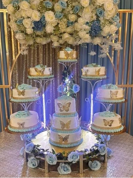 Base de acero macizo con recubrimiento de pintura electroestática color cromo de gran duración. Lista para utilizarse, cada «poste» se desarma así que es muy práctica para transportarla solo coloca tus pasteles y estarán listos para ser los protagonistas del evento. El aro central será tu gran aliado para llegar a los kilos deseados, tiene una cruz central que te permite colocar pasteles de cualquier diámetro,  si es un evento pequeño puedes colocar un pastel de un piso o no colocar nada, si es un gran evento coloca un pastel de pisos, no te preocupes por la resistencia, soporta hasta 50 kilos.