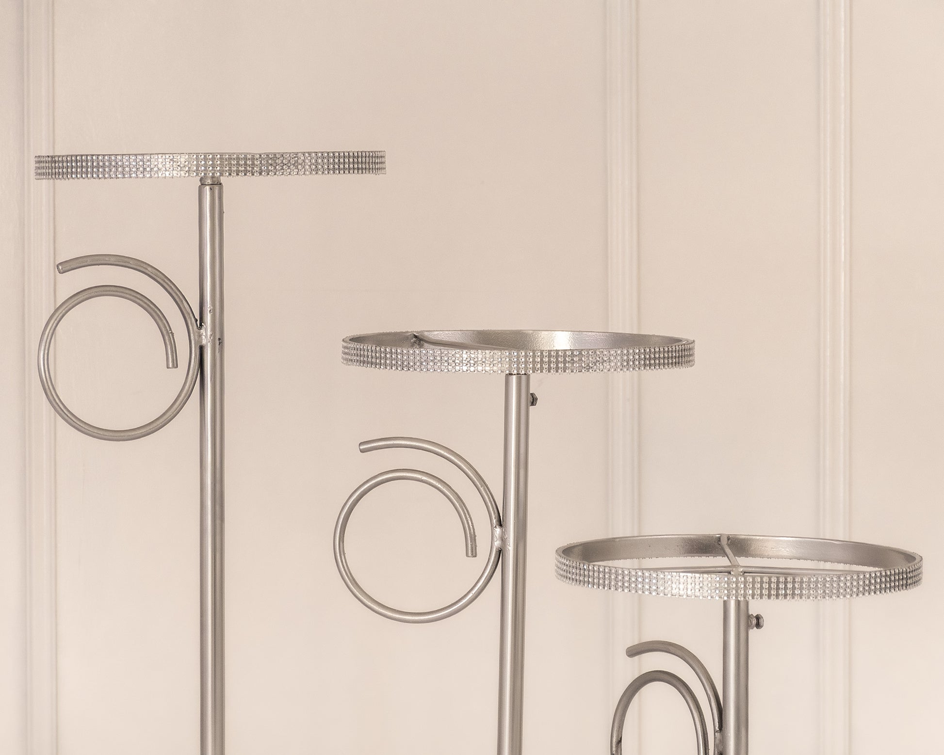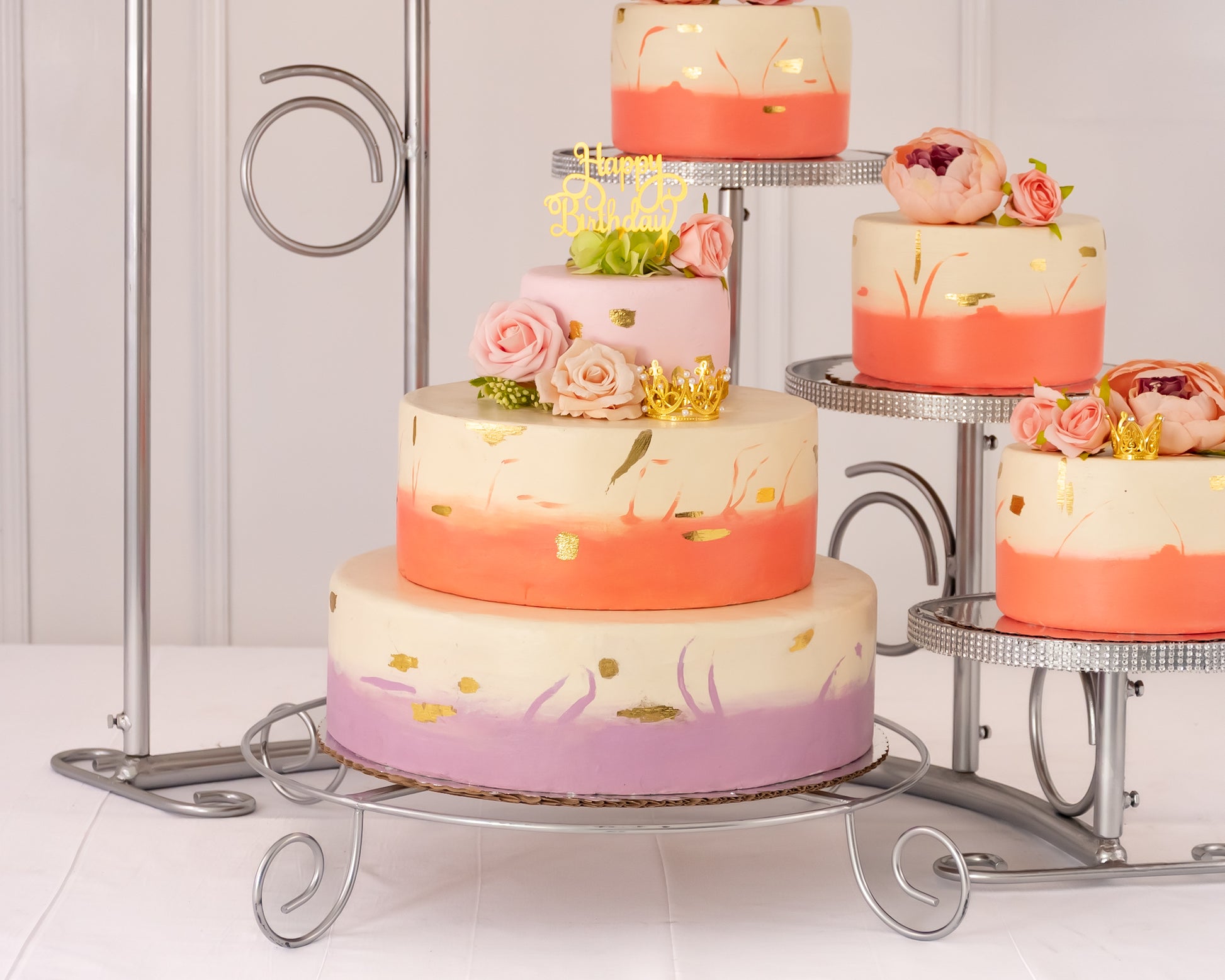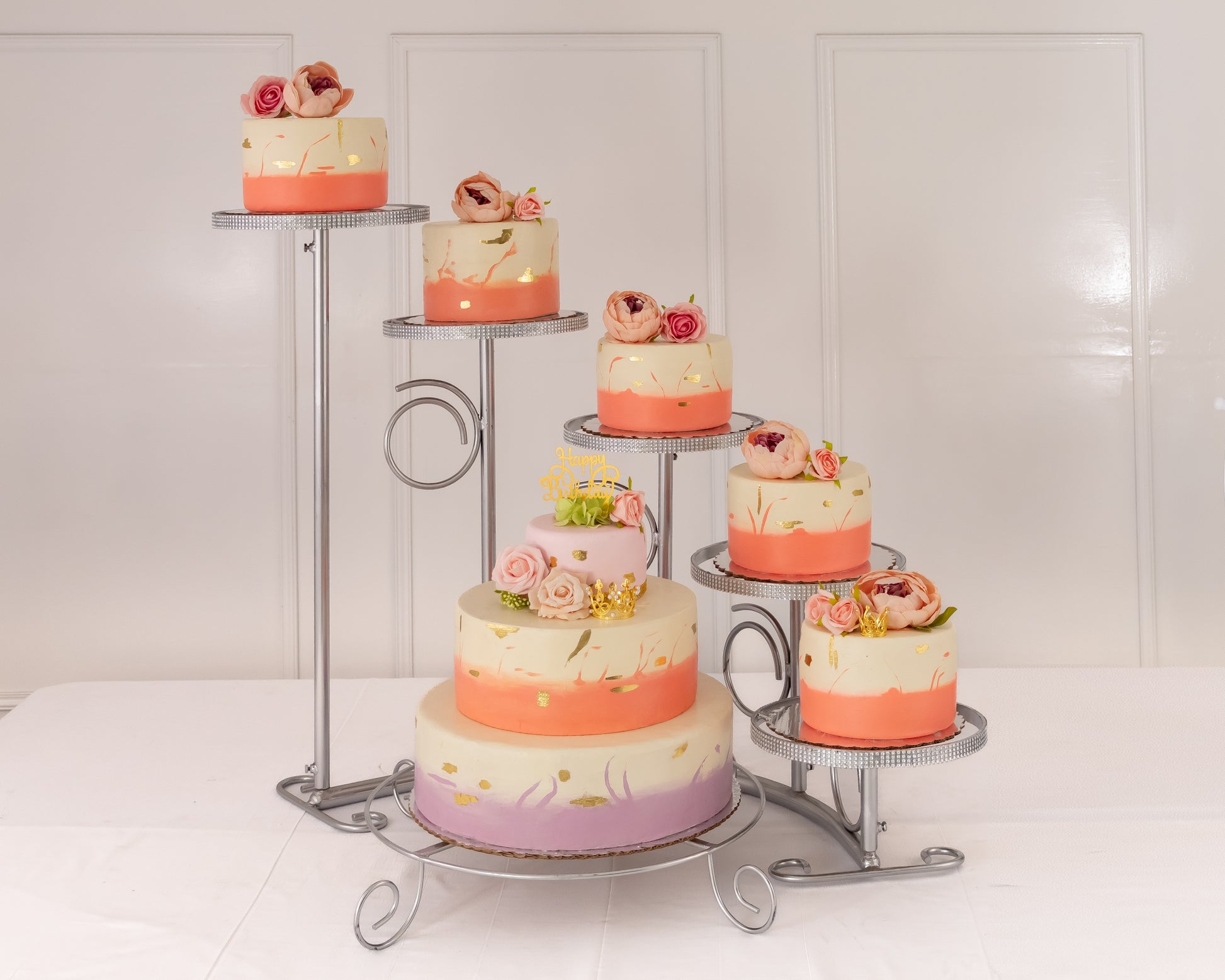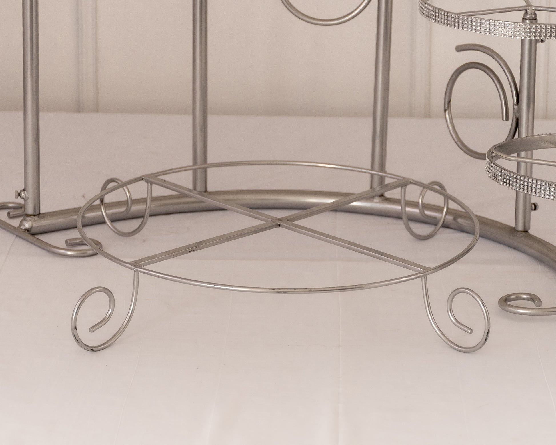 Hermosa base de acero con recubrimiento de pintura horneada de gran calidad. Cada poste se desarma así que puede usar los 5 pasteles o los que necesites, el aro de 20 pulgadas lo mandamos suelto así que puedes utilizarlo o no.