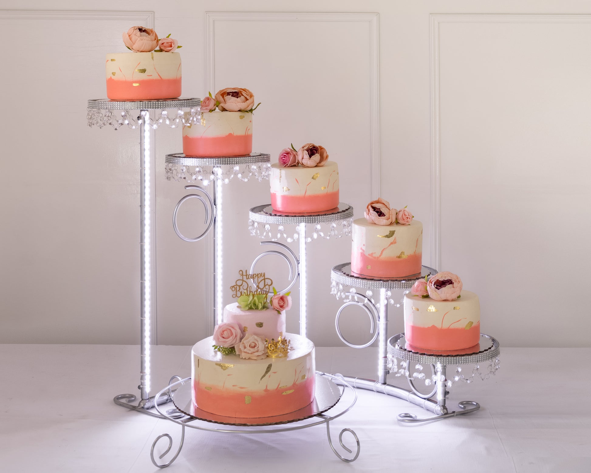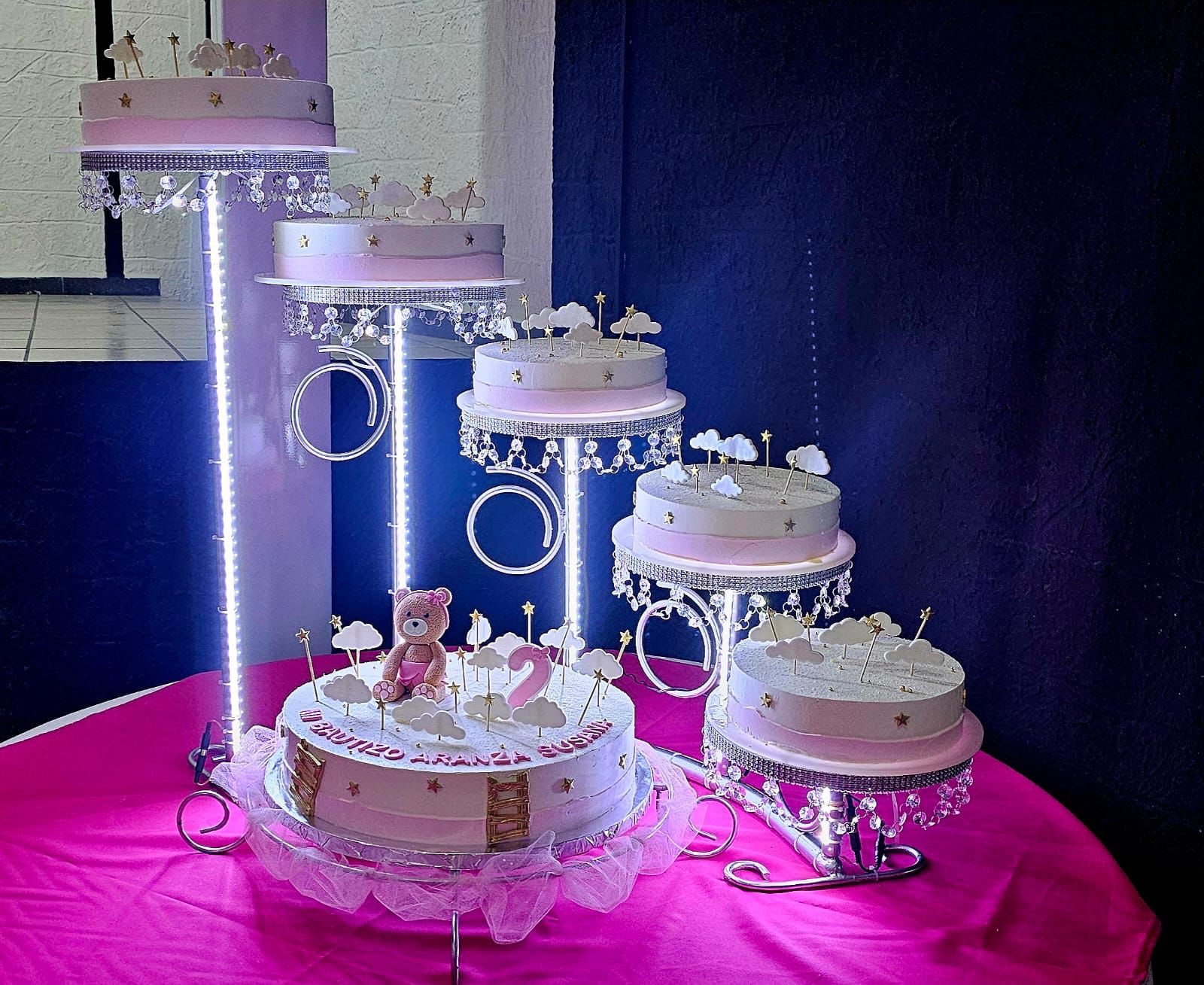 Hermosa base de acero con pintura CROMO horneada de gran calidad. Cada poste se desarma así que puede usar los 5 pasteles o los que necesites, el aro de 20 pulgadas lo mandamos suelto así que puedes utilizarlo o no. La luz LED y los cristales acrílicos brindan un toque de sofisticación que hará que tus pasteles luzcan increíbles.