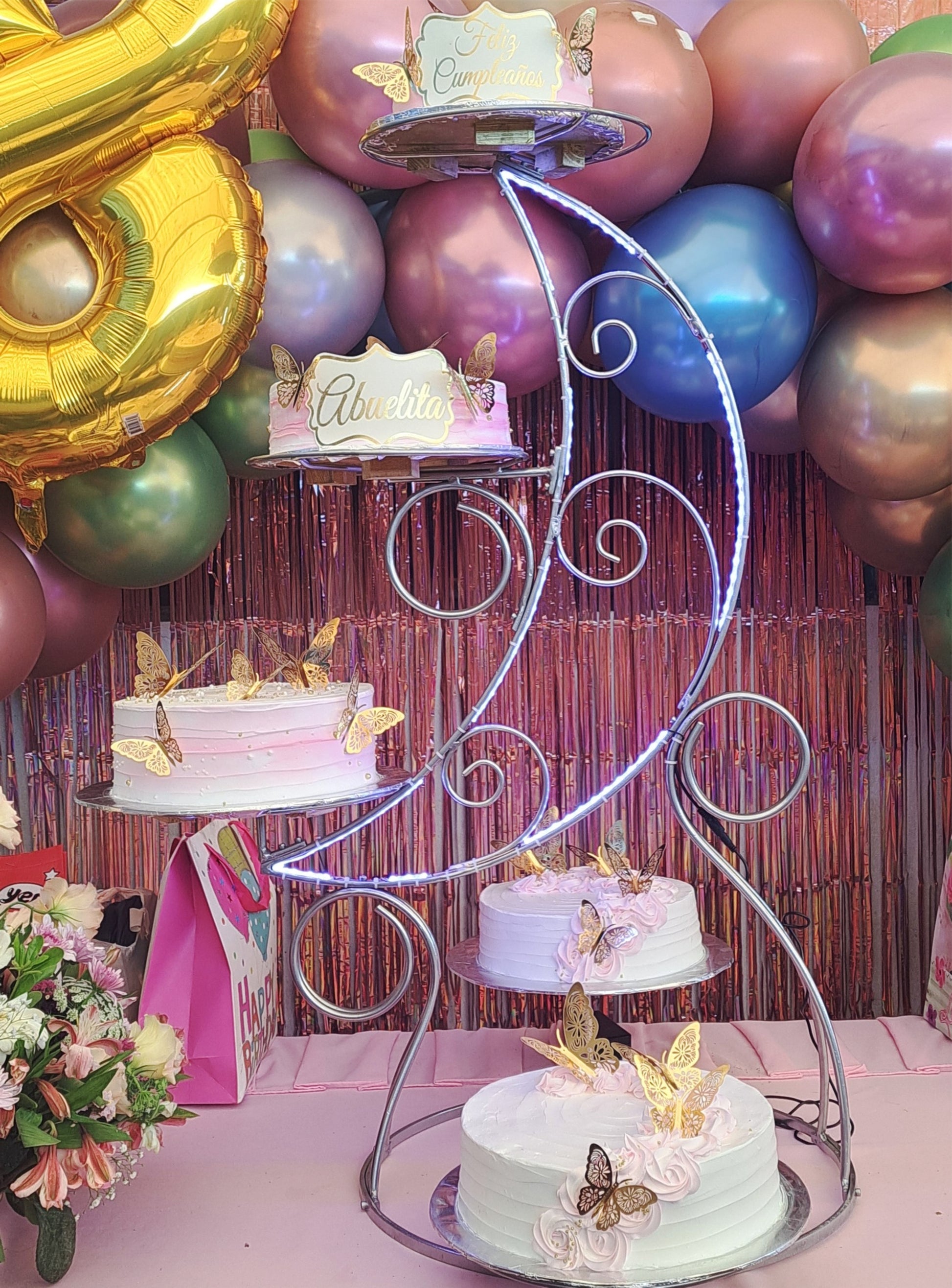 Esta encantadora base es muy solicitada para pasteles de Quince años. Coloca tus pasteles y verlos brillar con el detalle de led, hará aún más especial tu presentación. Eleva tus pasteles y sorprende a tus clientes con bases temáticas de ensueño