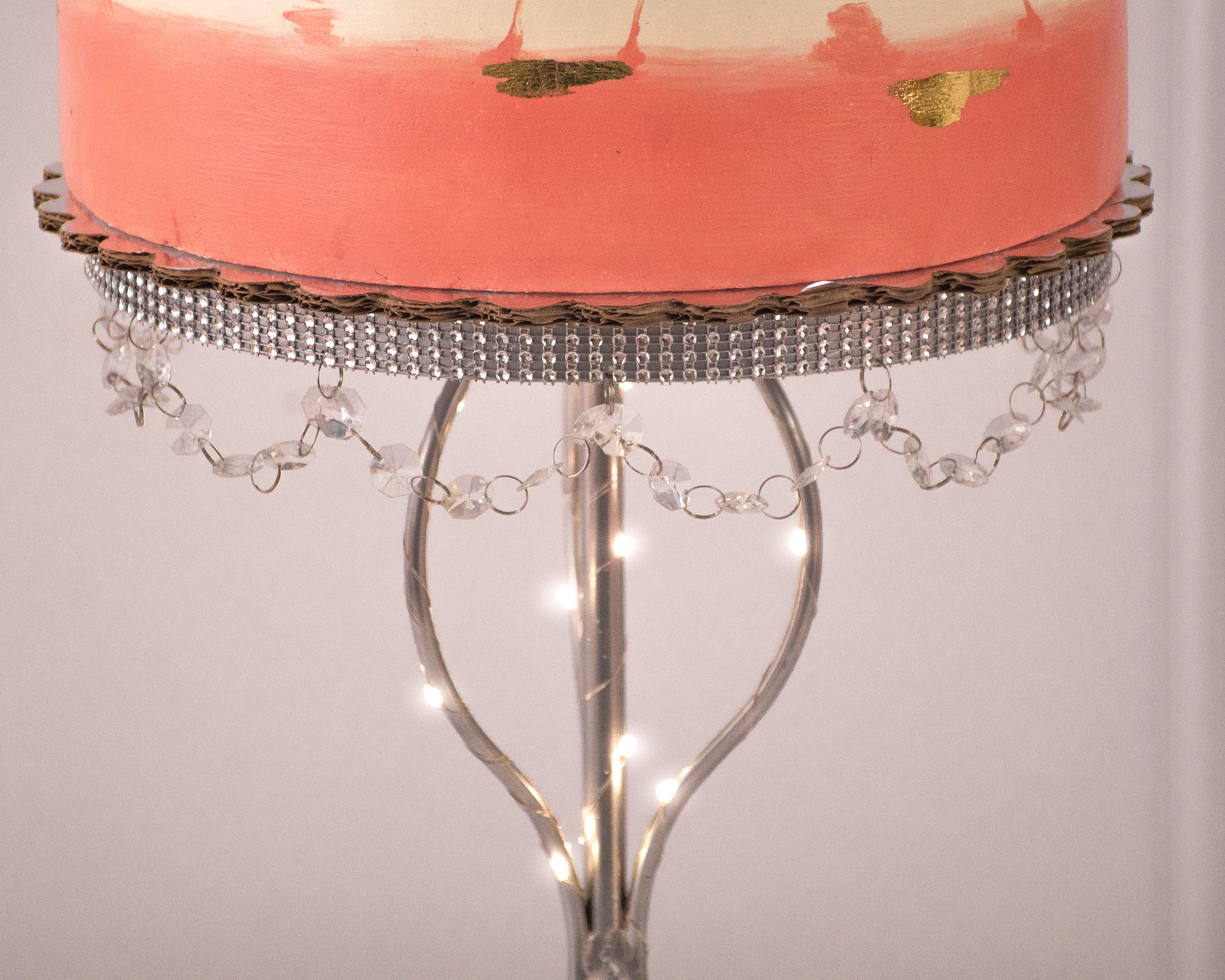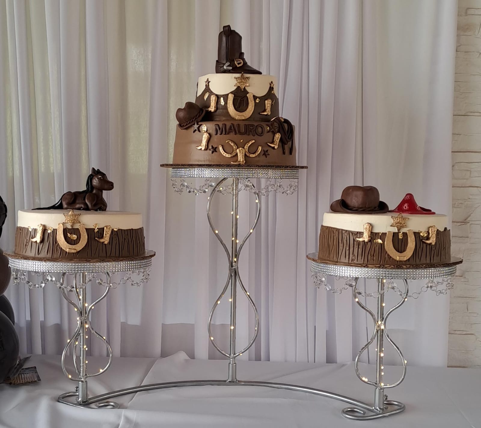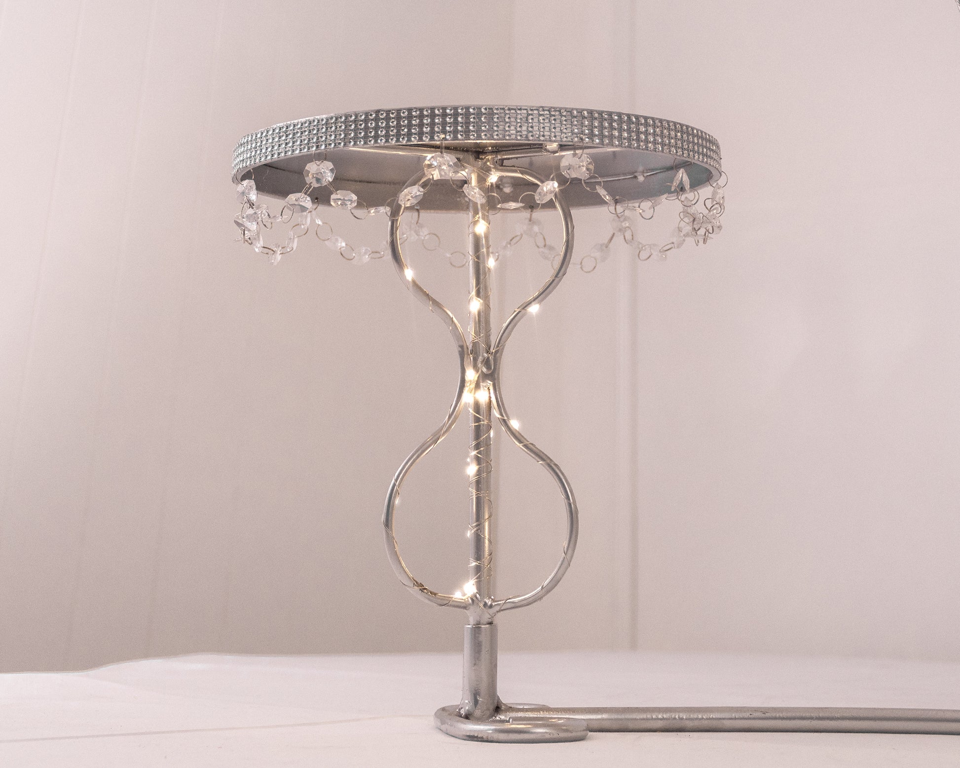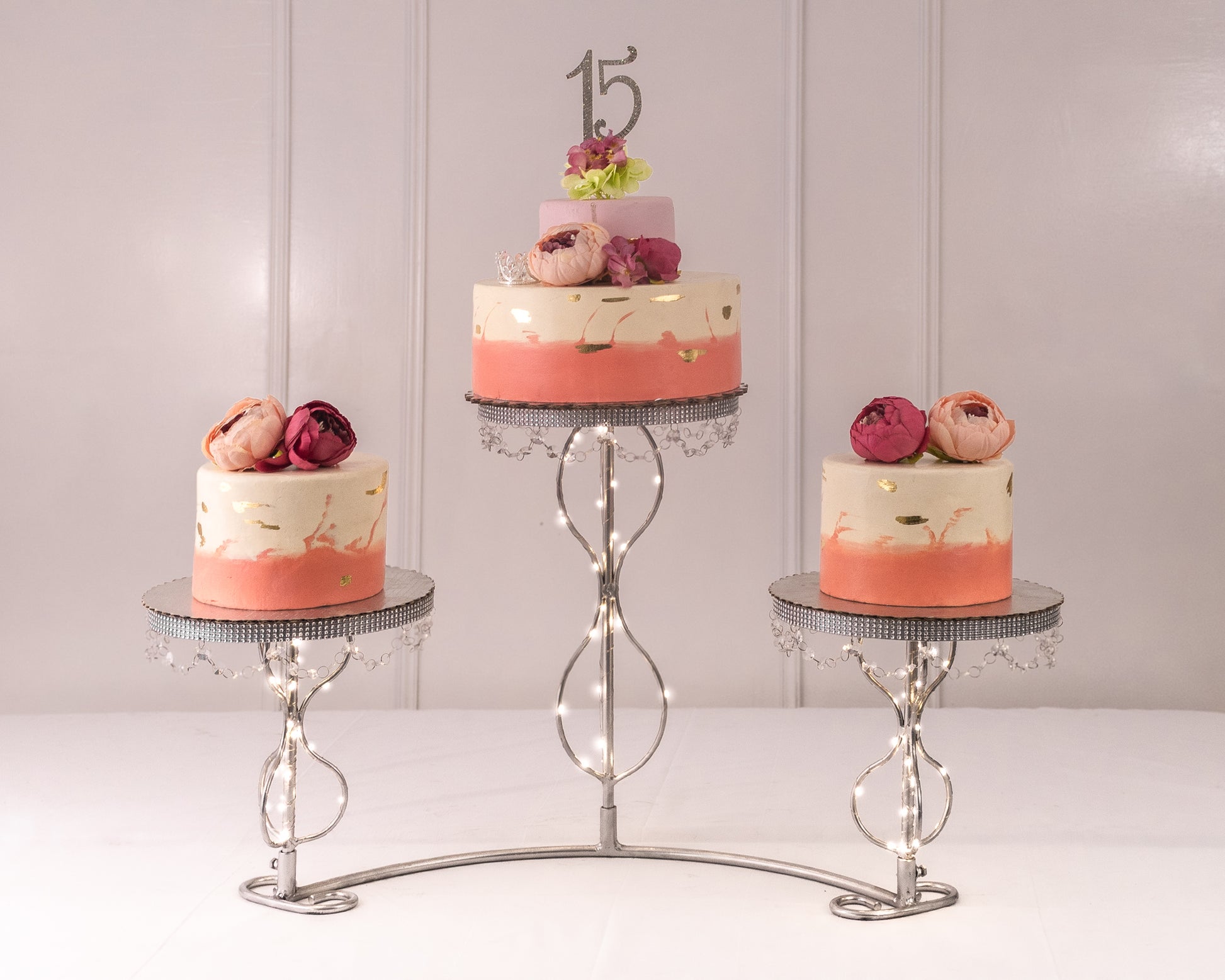 Hermosa base para pastel decorativa. Elaborada con acero macizo y recubrimiento de pintura horneada con gran resistencia a la oxidación.  Cada pedestal  es desmontable lo que la hace muy práctica para transportar. Esta base para pastel y postres tiene hermosos detalles, un listón metálico que rodea cada aro y le da un toque elegante, pedestales con curvas y luz de pilas que pueden encender o mantenerlas apagadas según la ocasión para deslumbrar a tus clientes y amigos. Las pilas pueden reponerse.