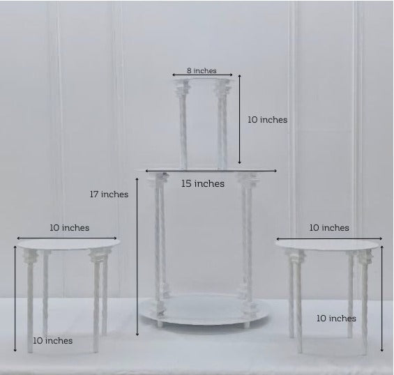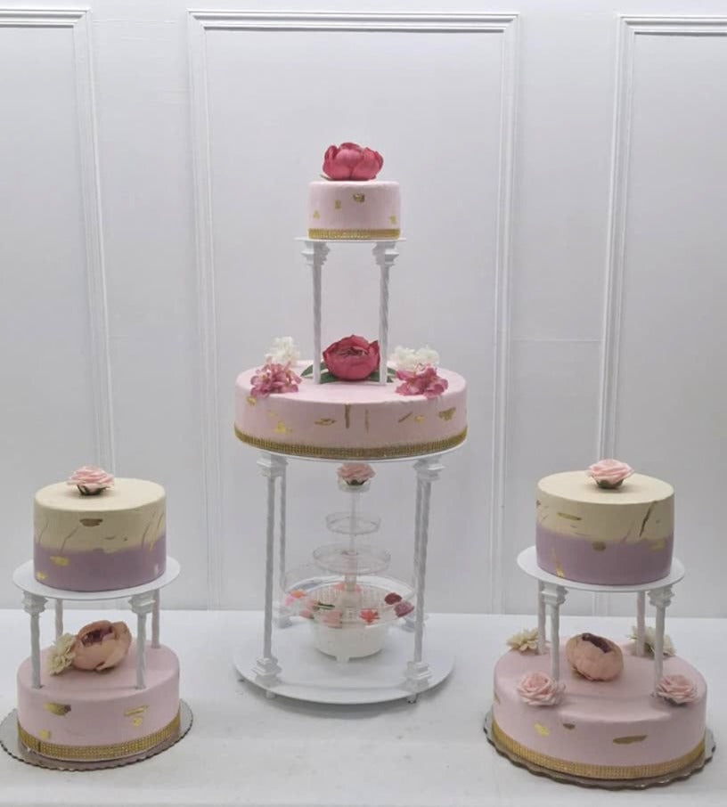Base ornamental de acero con recubrimiento de pintura electrostática color blanco de gran duración. Incluye cuatro pilares desmontables que permiten crear estructuras elegantes y firmes para resaltar tus pasteles. Su diseño clásico combina estabilidad y ligereza visual, ideal para pasteles de boda, XV años o eventos con temática romántica.