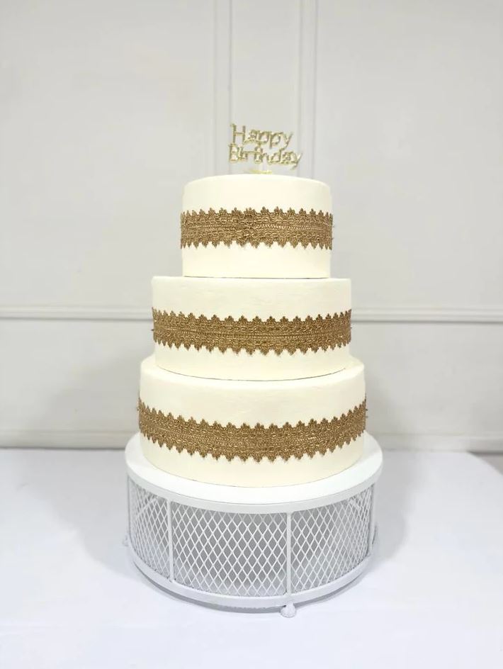 Este soporte es ideal para sostener tus pasteles pesados, su lamina brillante le da un gran acabado y su malla te permite colocar flores, follaje, plumas, etc. para resaltar tus pasteles. Estamos seguros que tu toque especial hará que este soporte sea una gran opción para usarlo solo, o con los buzos malla. De cualquier forma añadirá un toque vanguardista a tus pasteles, solo o con decoración elevará tus pasteles de la forma más elegante. Soporta hasta 40 kilos.